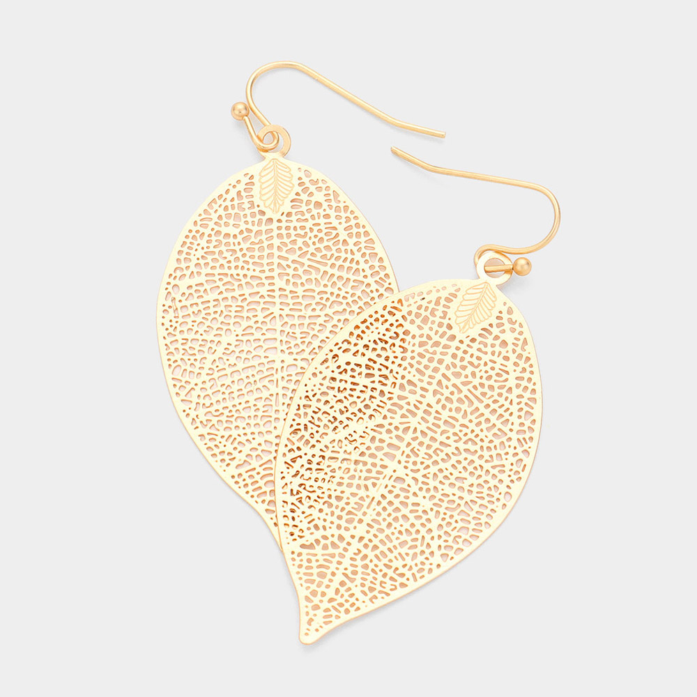 Brass Metal Filigree Tropical Leaf Dangle Earrings