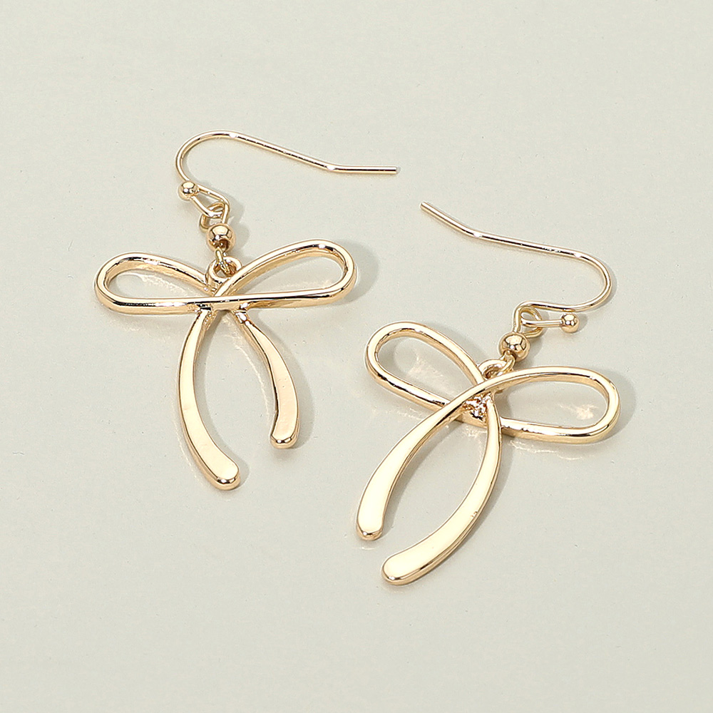 Details • Size : 1" X 1.75" • Fish Hook Back • Delicate open bow drop earrings with a minimalist wireframe design that exudes elegance and charm. Lightweight and versatile, these earrings add a touch of playful sophistication, making them a perfect choice for both casual outings and special occasions. • Lead and Nickel Compliant