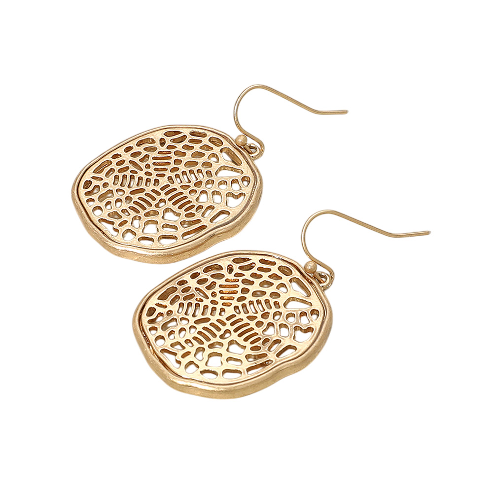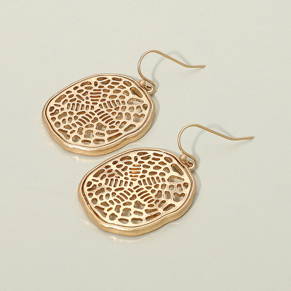 • Filigree drop earrings featuring intricate cutout details in a rounded organic shape. Lightweight and stylish, these earrings add a refined yet artistic touch, making them perfect for everyday wear or special occasions.