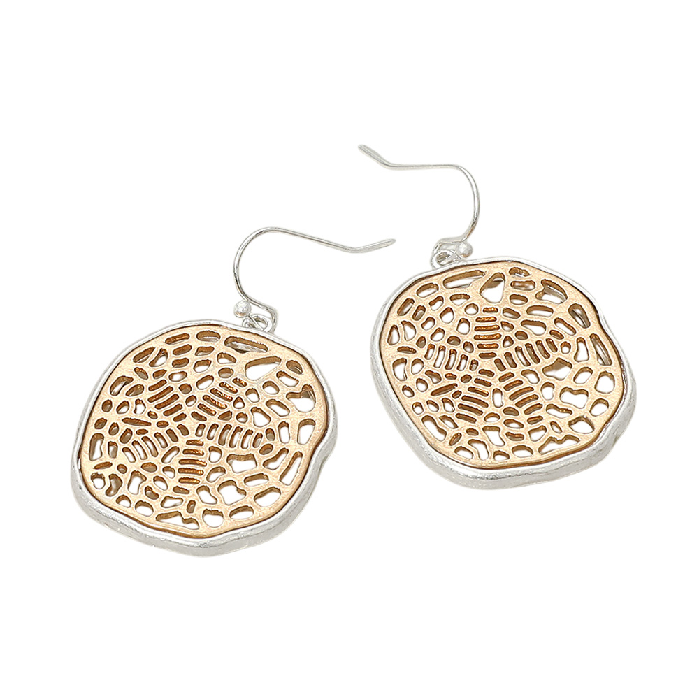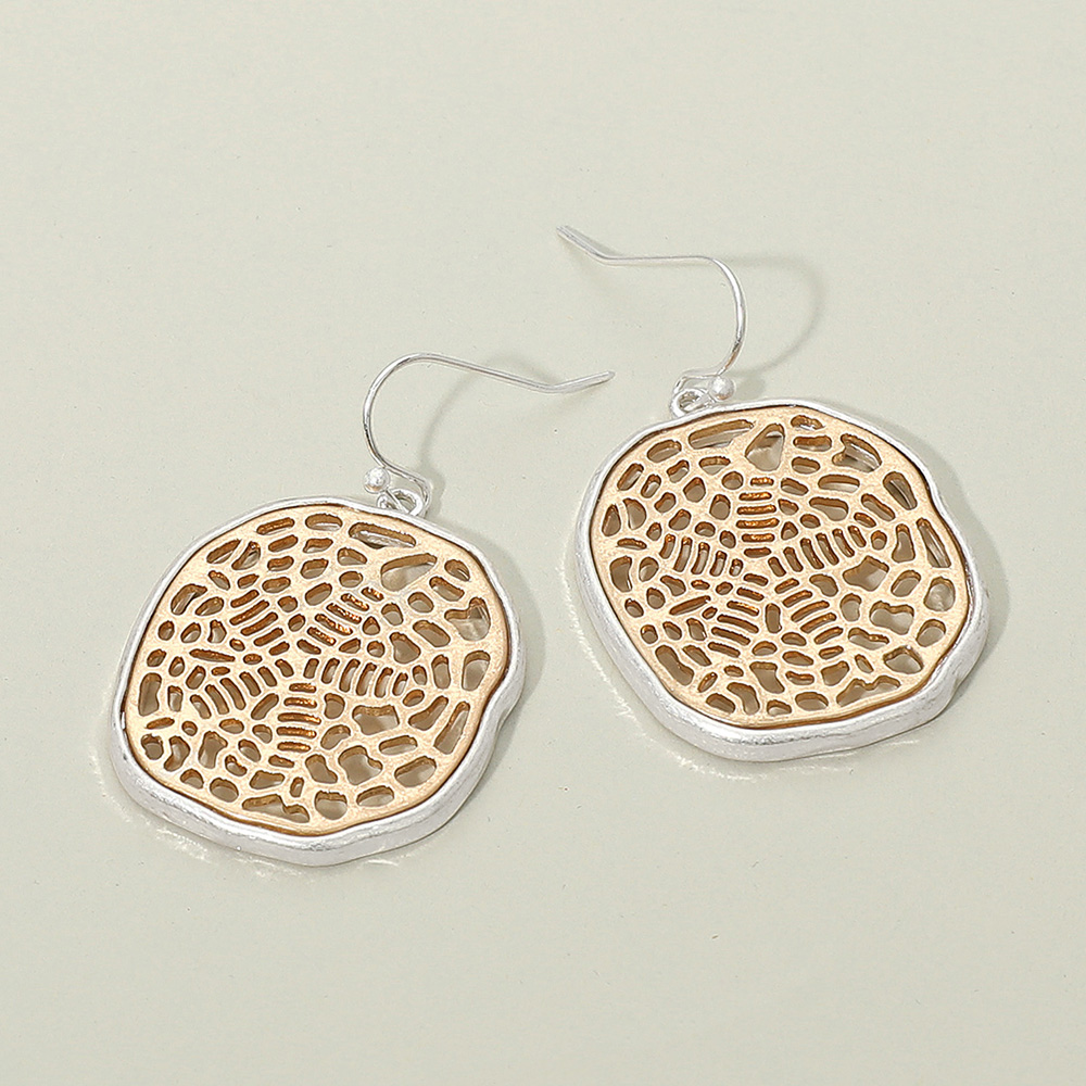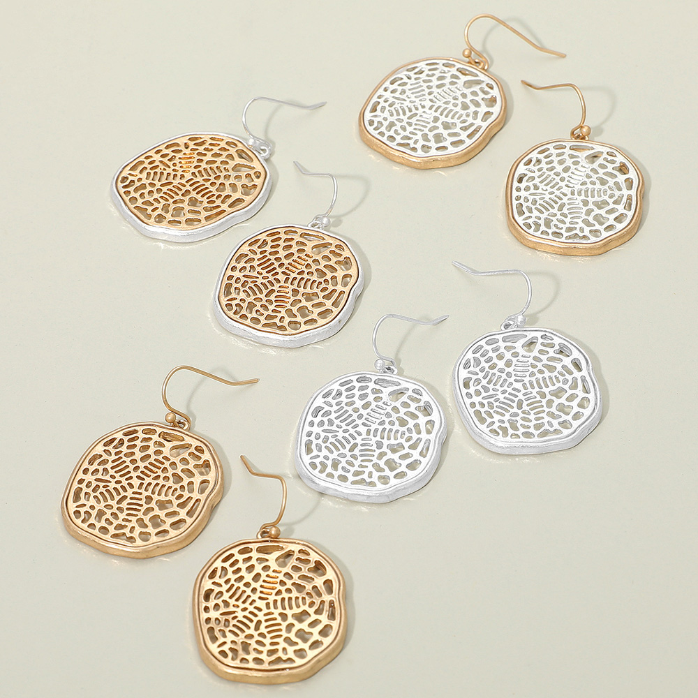 • Filigree drop earrings featuring intricate cutout details in a rounded organic shape. Lightweight and stylish, these earrings add a refined yet artistic touch, making them perfect for everyday wear or special occasions.