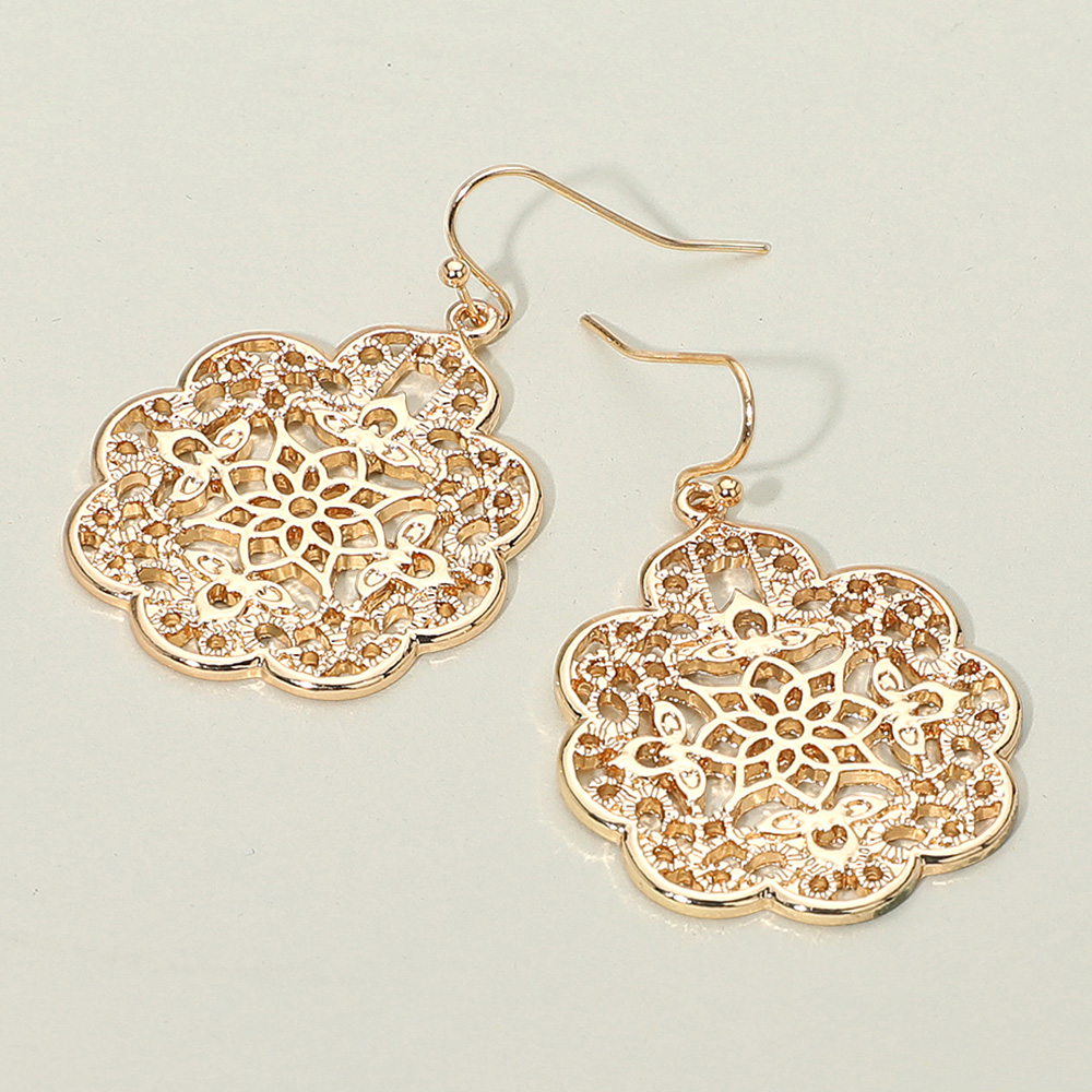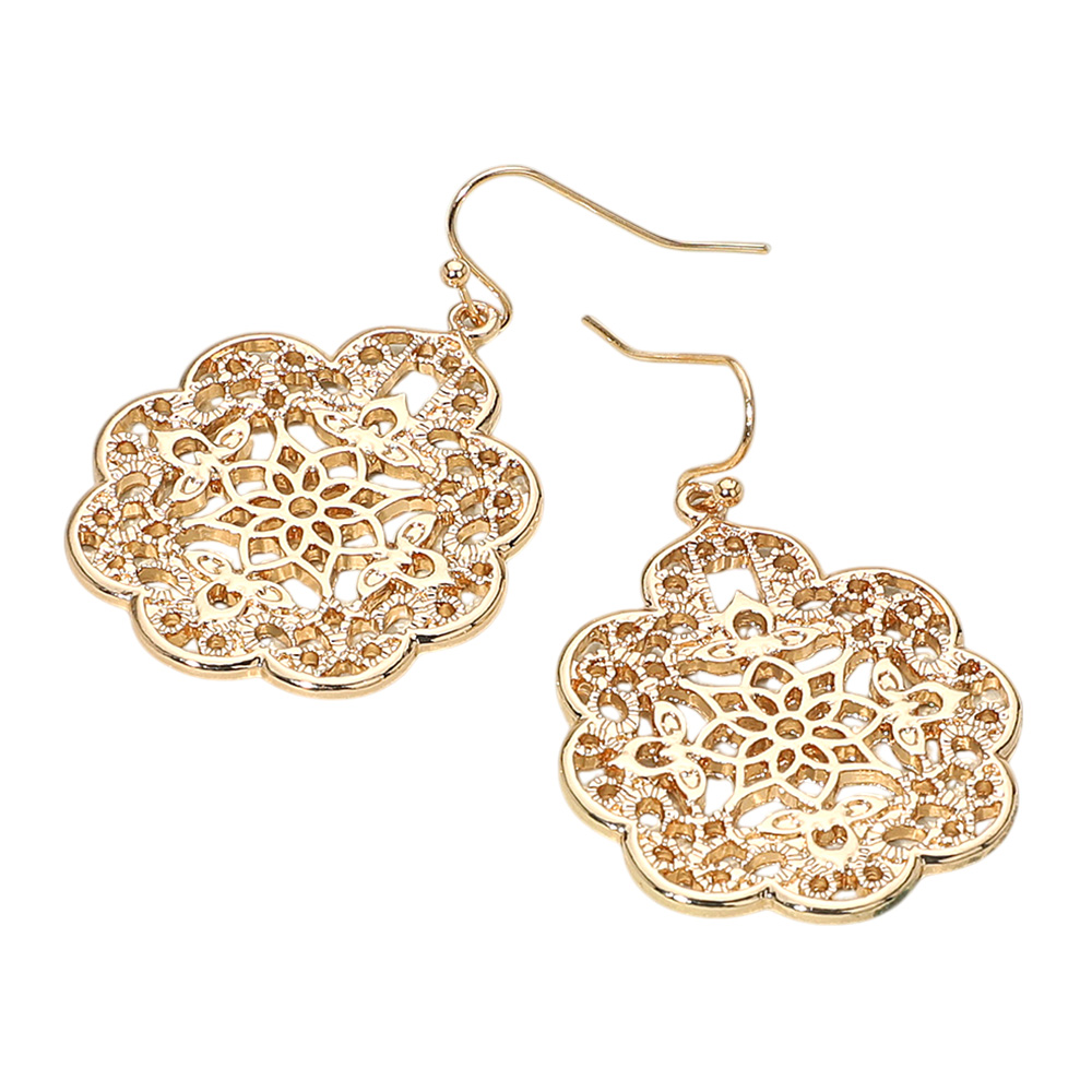 Details • Size : 1.2" X 1.75" • Fish Hook Back • Elegant filigree flower dangle earrings crafted with intricate cut-out details, perfect for adding a touch of charm to any outfit. Lightweight and stylish, these earrings complement casual and dressy looks, making them an essential accessory for effortless everyday elegance. • Lead and Nickel Compliant
