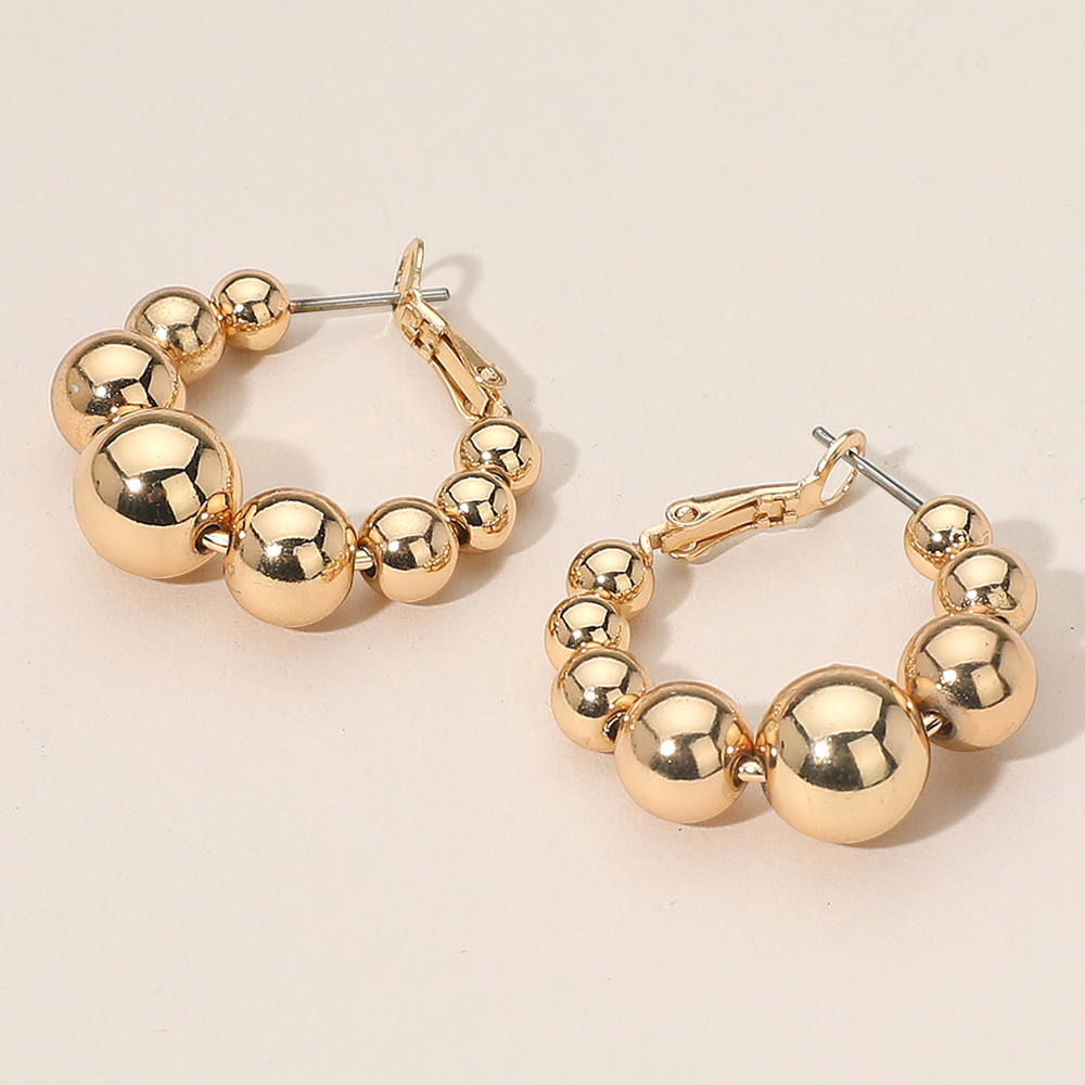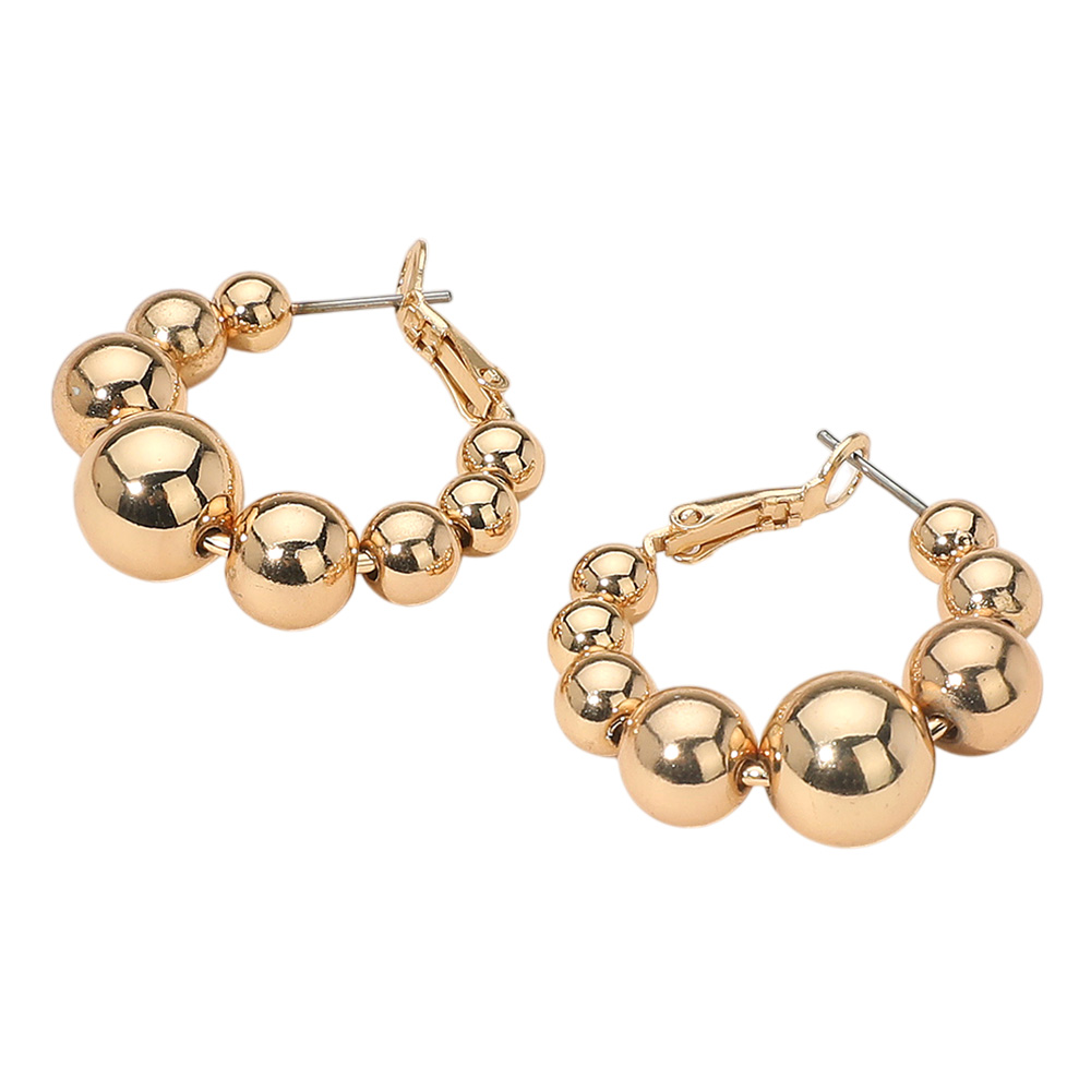 Details • Size : 1.2" X 1.25" • Omega Back • Elevate your accessory game with these beaded hoop earrings featuring graduated spheres for a chic, modern silhouette. Perfect for casual or dressy looks, their versatile design adds bold style and timeless appeal to any outfit. • Brass • Lead and Nickel Compliant
