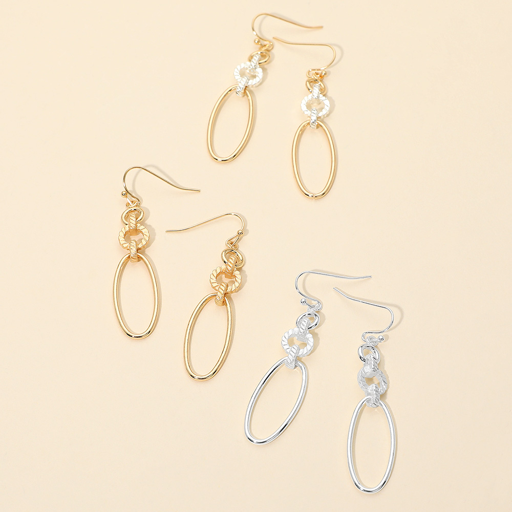 Details • Size : 0.5" X 2.25" • Fish Hook Back • Elevate any look with these metal oval drop earrings featuring textured accents and fluid linked shapes. Their lightweight, elegant design offers versatile styling for both casual days and refined evenings, adding a polished, modern touch to your accessory collection. • Lead and Nickel Compliant