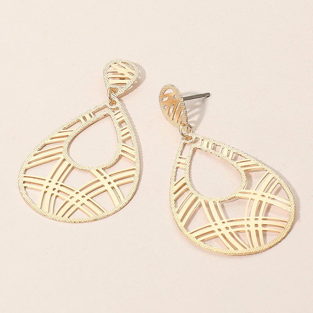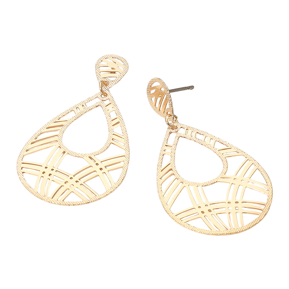 Details • Size : 1.1" X 1.9" • Post Back • Elegant teardrop earrings with open cutout geometric patterns, offering a chic and modern statement style. Lightweight and stylish, these earrings are perfect for dressing up everyday outfits or adding flair to evening looks. • Lead and Nickel Compliant