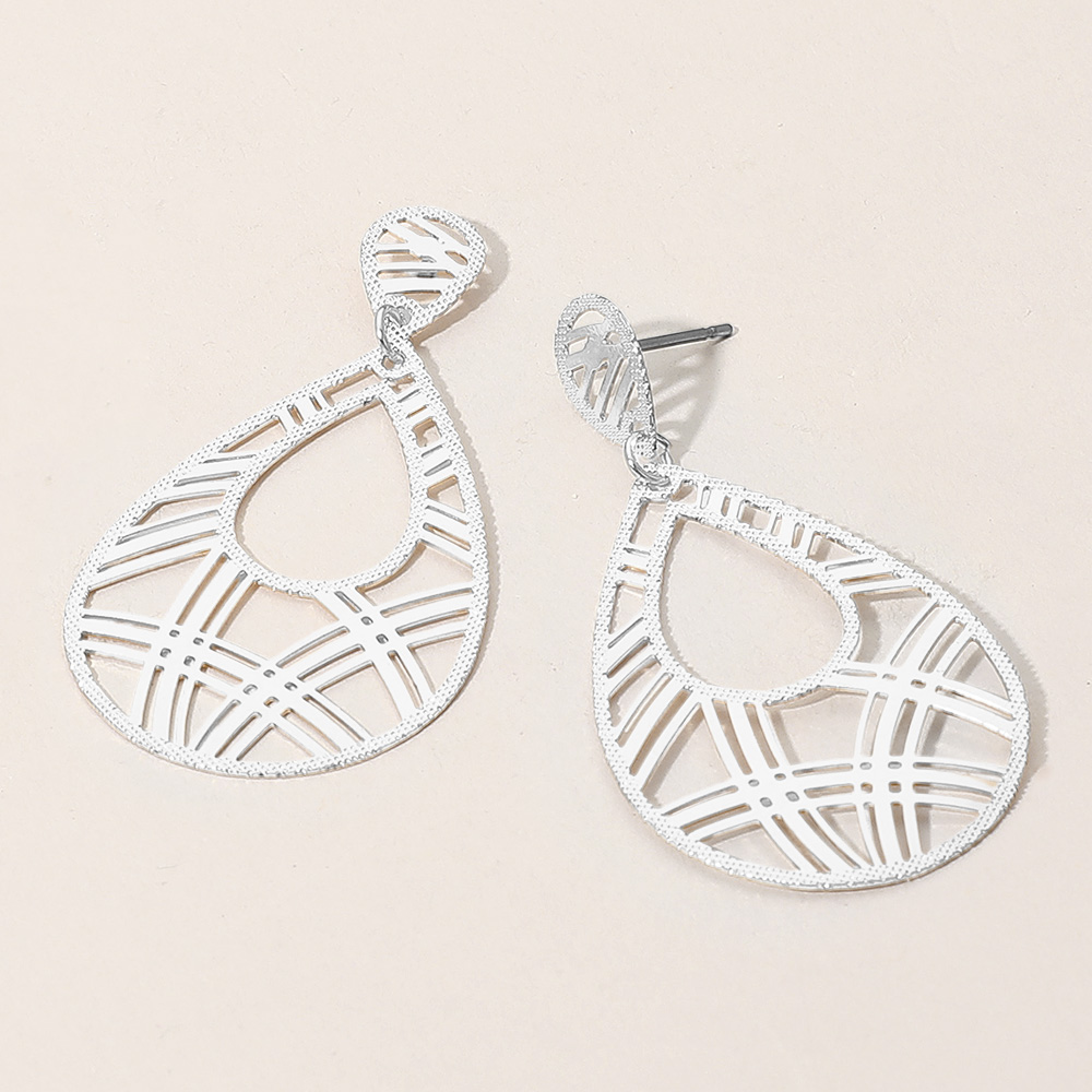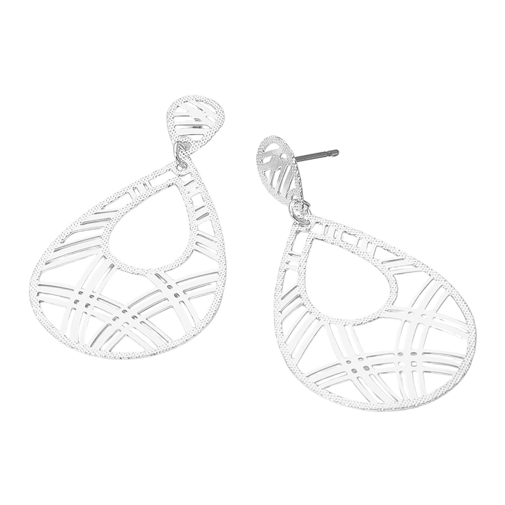 Details • Size : 1.1" X 1.9" • Post Back • Elegant teardrop earrings with open cutout geometric patterns, offering a chic and modern statement style. Lightweight and stylish, these earrings are perfect for dressing up everyday outfits or adding flair to evening looks. • Lead and Nickel Compliant