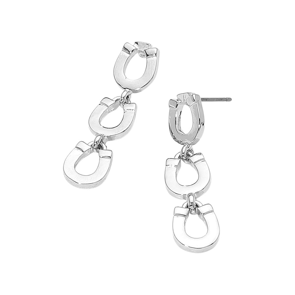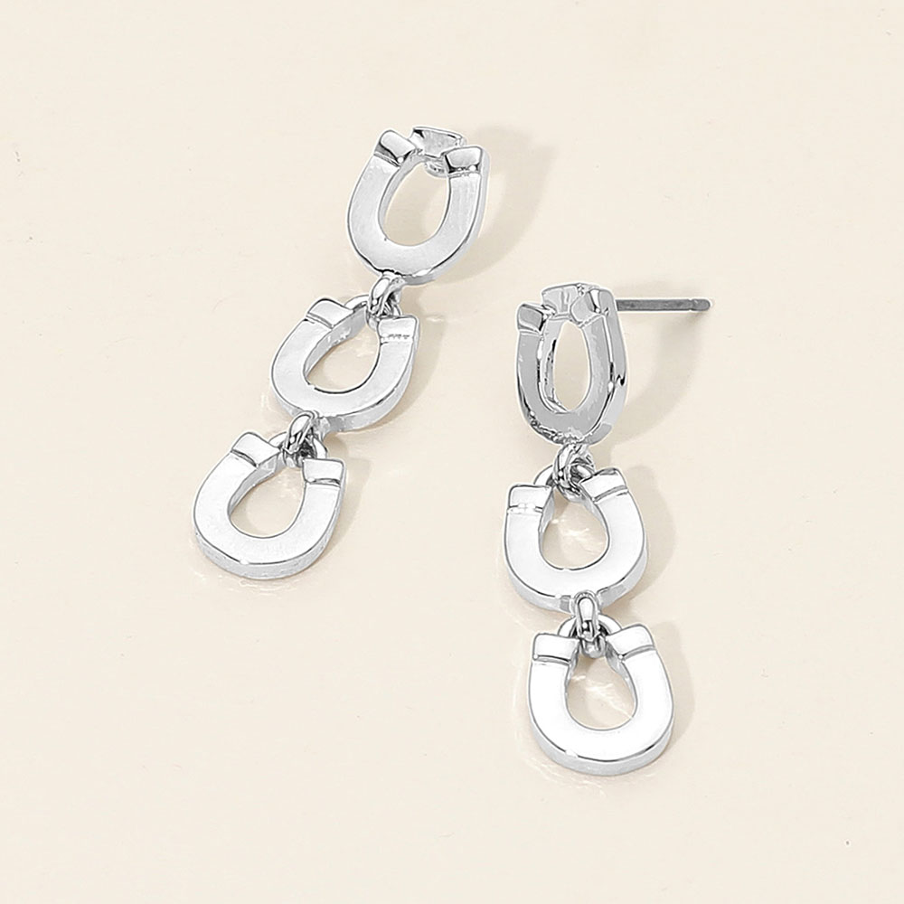 Details • Size : 0.3" X 1.4" • Post Back • Add a touch of contemporary charm with these triple horseshoe drop earrings. Featuring a sleek linked design that moves gracefully, they bring a stylish edge to both day and evening outfits, making them a versatile and eye-catching accessory. • Lead and Nickel Compliant