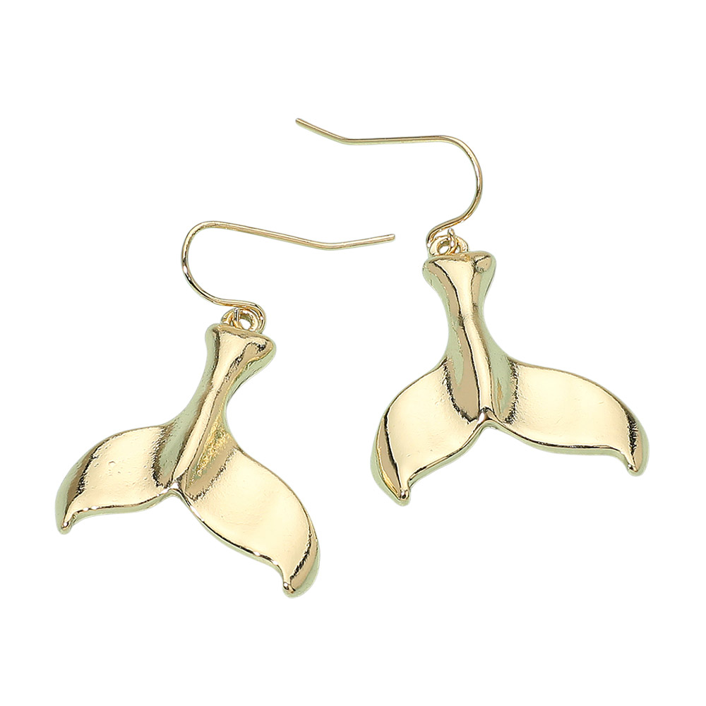 Details • Size : 1" X 1.4" • Fish Hook Back • Sleek whale tail drop earrings bring ocean-inspired style to any outfit with graceful sculpted curves and lightweight dangle design for comfortable all-day wear. Perfect for casual looks or travel-ready fashion, they add a charming statement accent with effortless versatility. • Lead and Nickel Compliant
