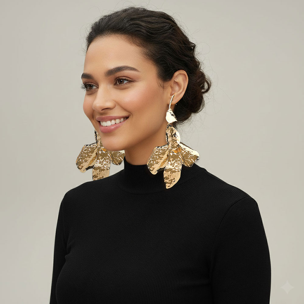 • Make a bold impression with these sculpted statement leaf dangle earrings. Featuring an abstract, hammered design that catches the light beautifully, they embody modern artistry and elegance. Perfect for elevating evening outfits or adding a dramatic edge to your daywear look.