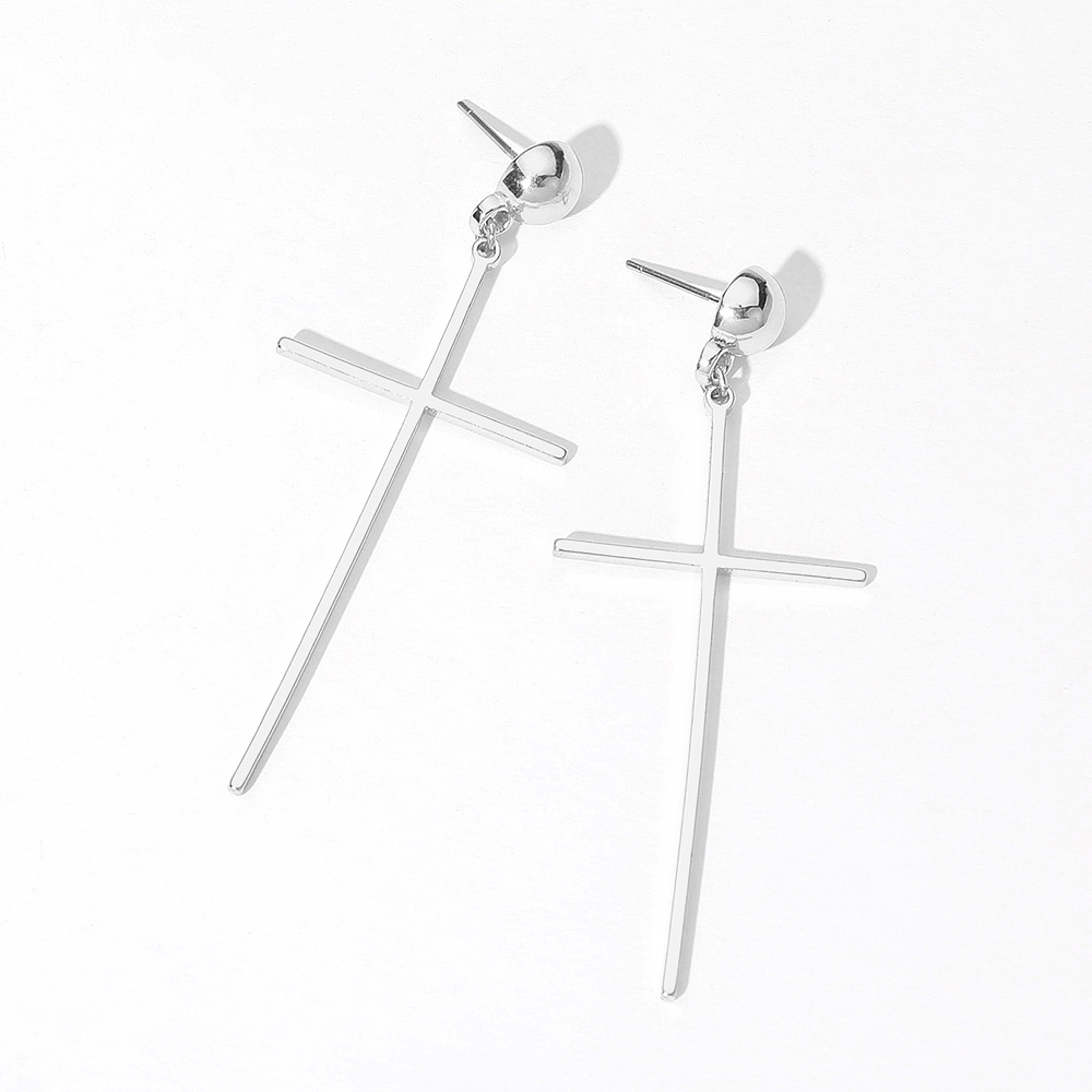 Details • Size : 1" X 2.6" • Post Back • Elegant cross drop earrings featuring a slender linear silhouette and modern minimalist style. Lightweight and refined, perfect for everyday wear or adding a subtle statement touch to special occasions. A chic accessory for any jewelry collection. • Sterling Silver Dipped