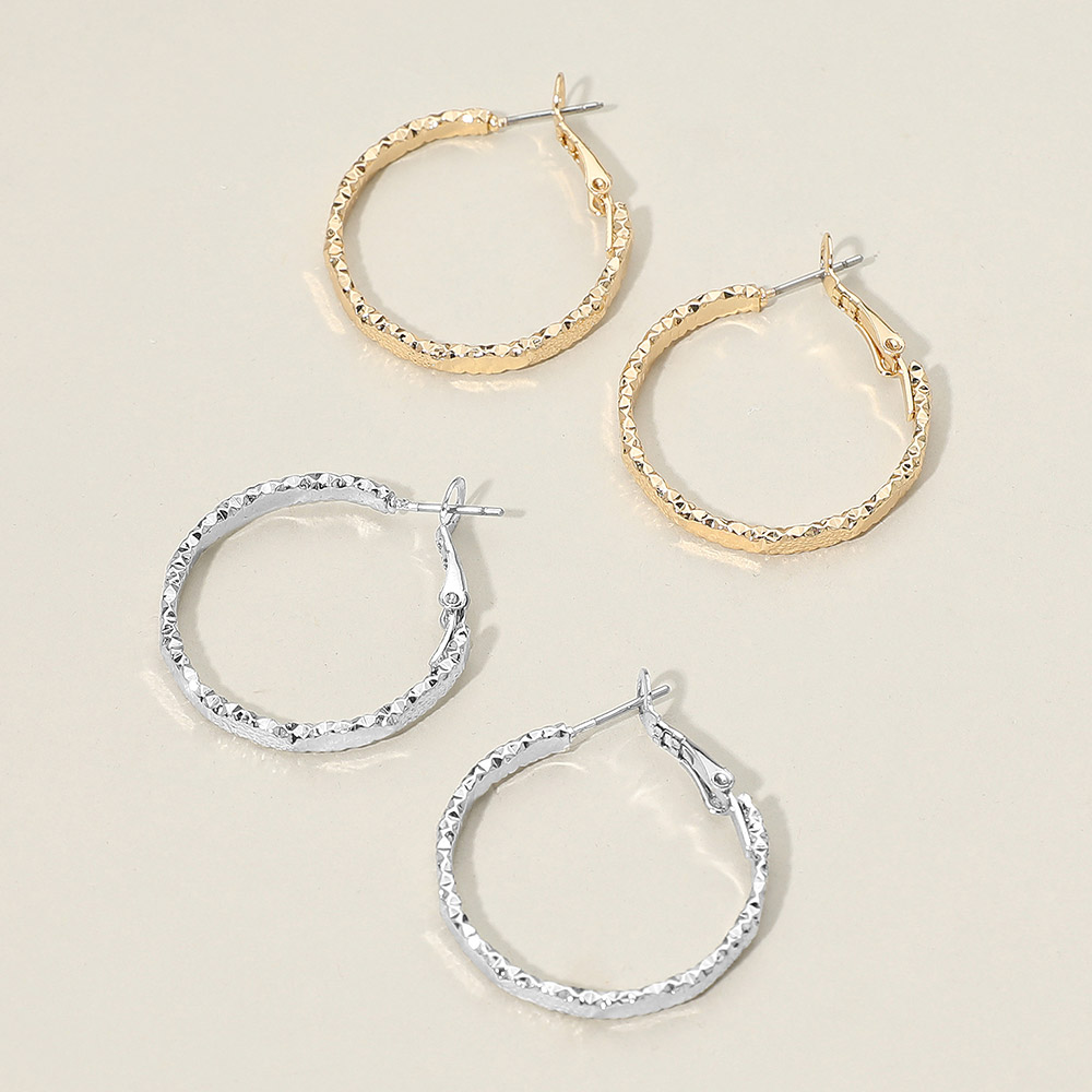 Details • Size : 1.2" X 1.2" • Omega Back • Small textured hoop earrings featuring a faceted pattern that adds shine and dimension. Lightweight and comfortable with a secure latch-back closure, perfect for everyday wear or adding subtle sparkle to any look. • Sterling Silver Dipped • Lead and Nickel Compliant