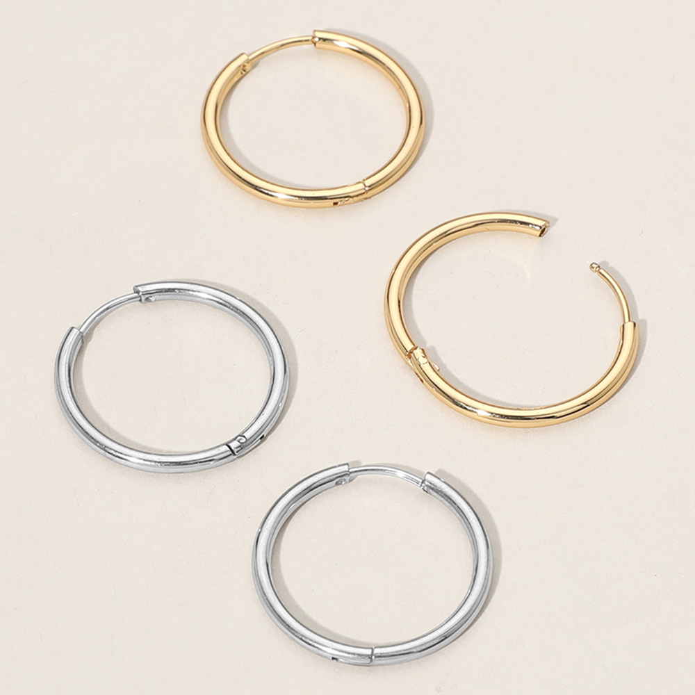 Details • Size : 0.9" X 0.9" • Huggie Back • Classic stainless steel hoop earrings designed for everyday wear. Hypoallergenic and tarnish-resistant, offering a timeless style with lasting durability and comfort for sensitive ears. • Hypoallergenic • Stainless Steel