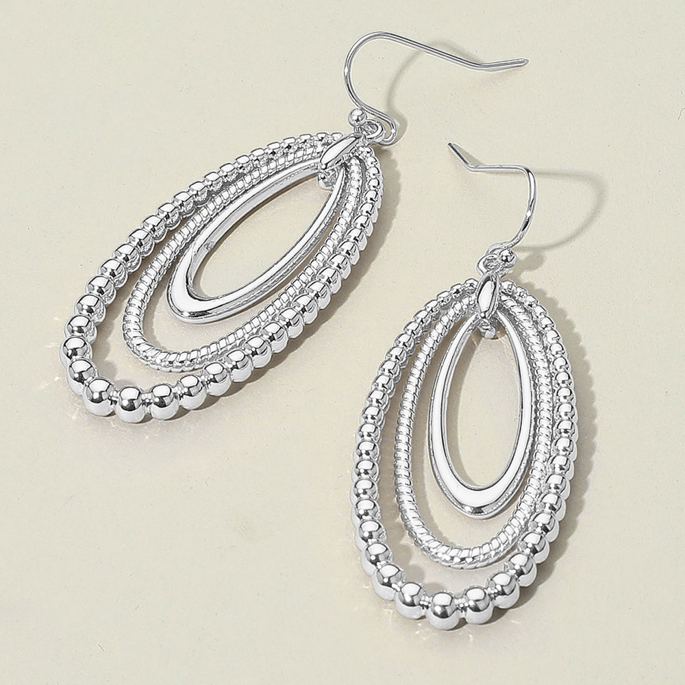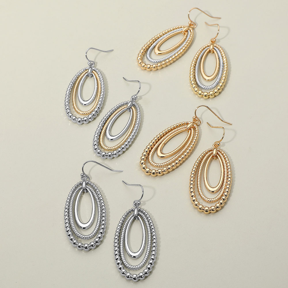 Details • Size : 0.8" X 2.25" • Fish Hook Back • Elegant layered oval drop earrings featuring multiple open oval shapes with smooth and textured bead accents. Lightweight and stylish, these earrings add a refined, modern flair to any outfit, making them perfect for both casual outings and special occasions. • Lead and Nickel Compliant