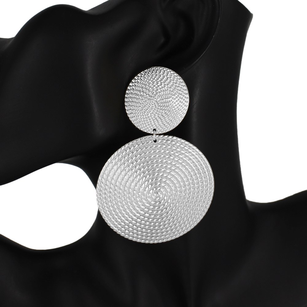 Details • Size : 2.25" X 3.3" • Post Back • Elevate your style with these modern double disc earrings featuring a sleek textured finish. Lightweight yet bold, they add effortless sophistication to casual or dressy looks. Perfect for making a contemporary statement at any occasion. • Lead and Nickel Compliant