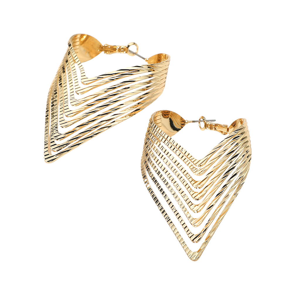 Details • Size : 1.7" X 2.4" • Omega Back • Make a bold, modern statement with these striking Abstract Chevron Hoop Earrings. These unique hoops feature a wide, pointed design with multiple layers of finely textured, woven lines that create an eye-catching, dimensional effect. The dynamic chevron shape gives them a strong geometric appeal, perfect for elevating any outfit from casual to evening wear. The earrings secure with a post-back and hinge closure, ensuring comfortable wear while delivering maximum style impact. • Lead and Nickel Compliant