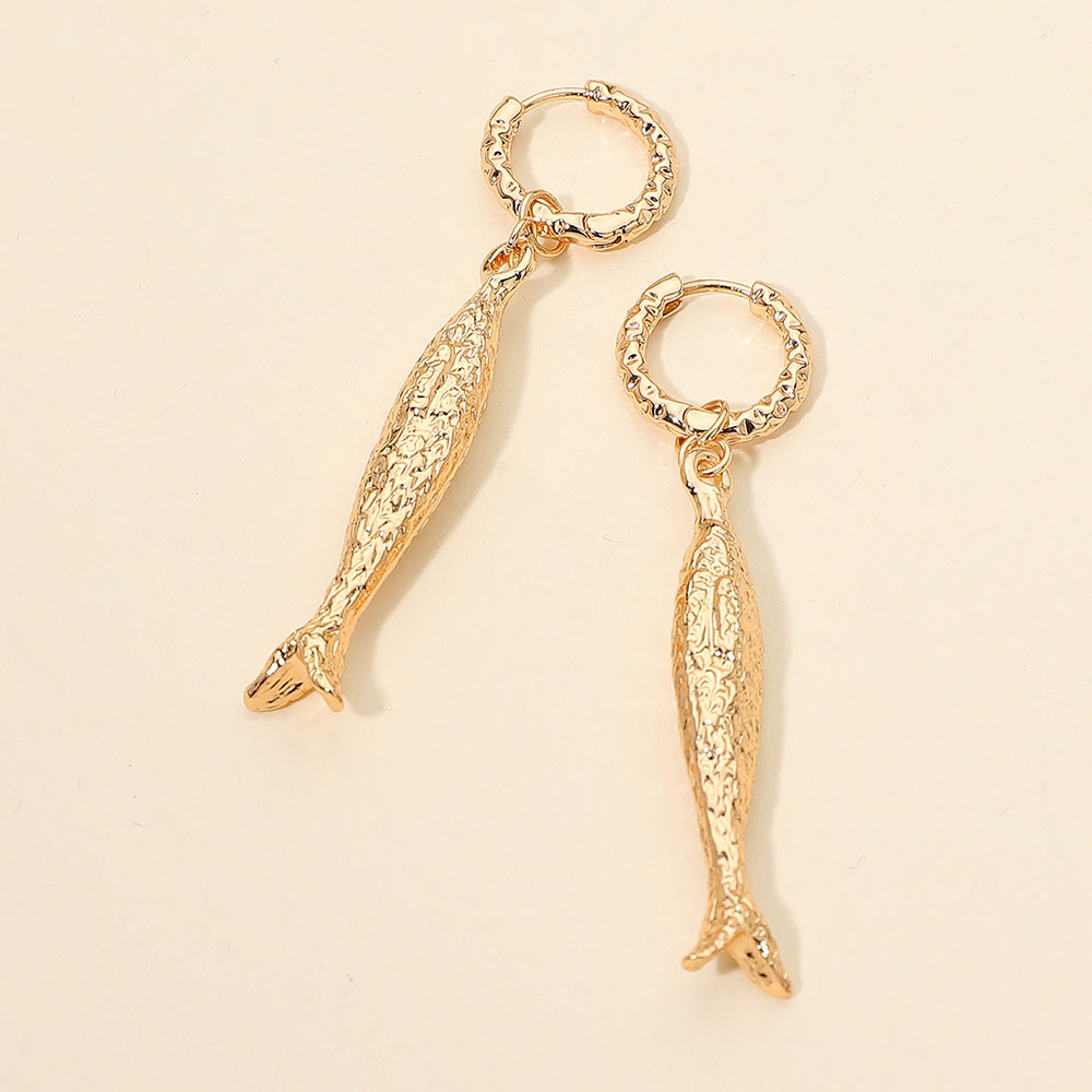 Details • Size : 0.6" X 2.5" • Huggie Back • These textured hoop earrings feature elongated fish-shaped charms for a playful, artistic touch. Lightweight and eye-catching, they add unique flair to casual or boho-inspired outfits, making them a standout accessory for anyone who loves bold, creative jewelry. • Lead and Nickel Compliant