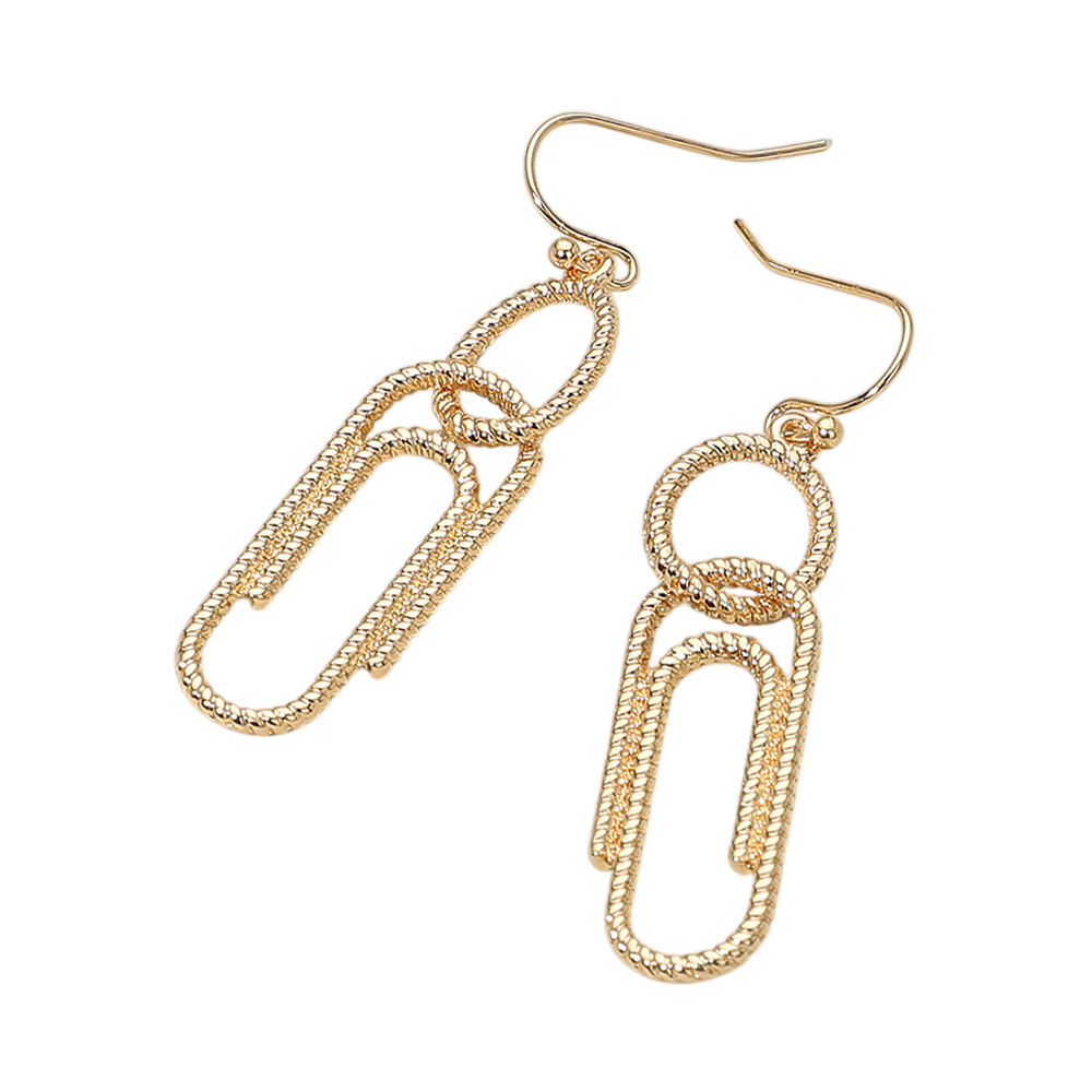 Details • Size : 0.75" X 2.1" • Fish Hook Back • Modern linked geometric drop earrings with an open chain-inspired design, combining circles and elongated loops for a sleek contemporary look. Lightweight and versatile, these statement earrings are perfect for elevating casual outfits or adding elegance to evening wear. • Lead and Nickel Compliant