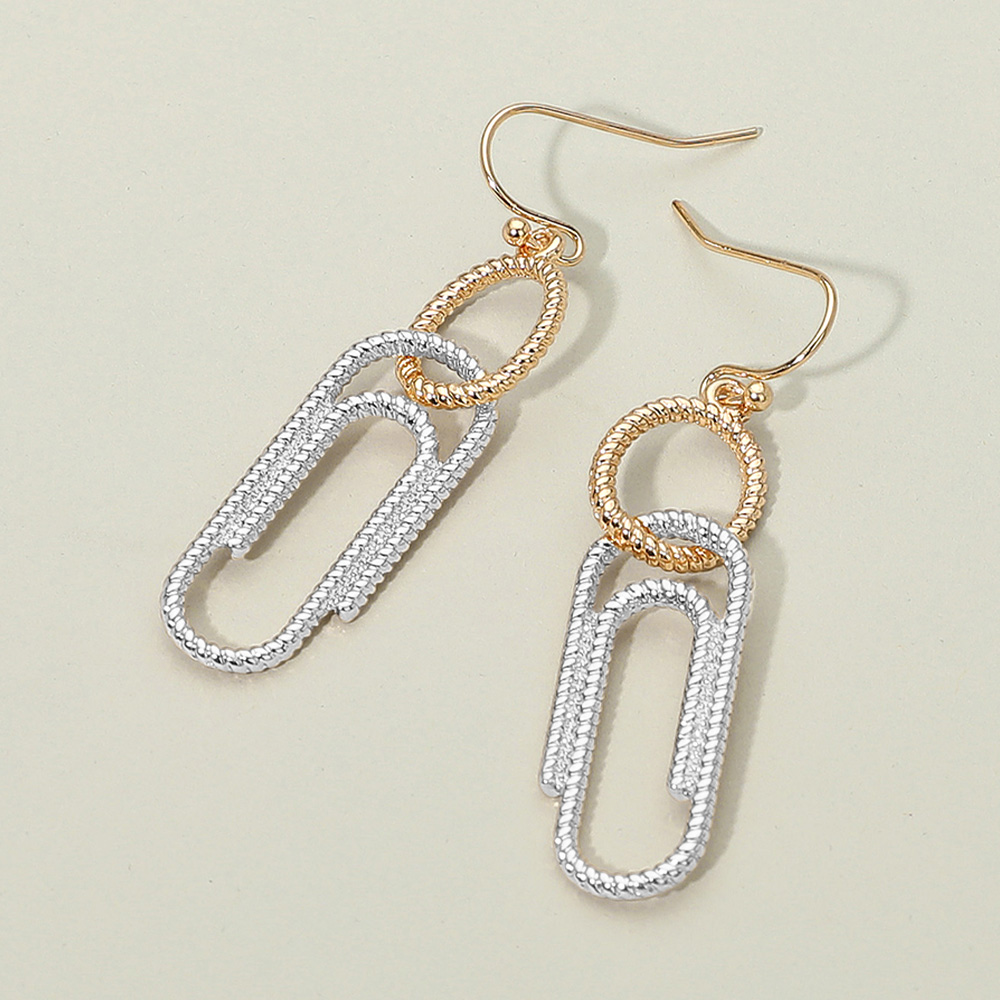 • Modern linked geometric drop earrings with an open chain-inspired design, combining circles and elongated loops for a sleek contemporary look. Lightweight and versatile, these statement earrings are perfect for elevating casual outfits or adding elegance to evening wear.