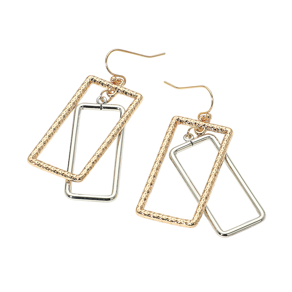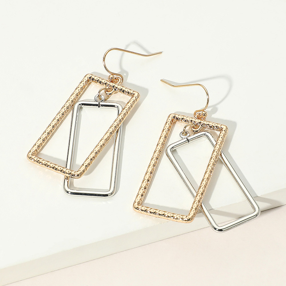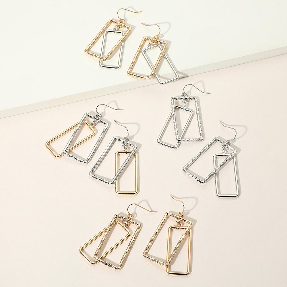 Details • Size : 0.75" X 2.2" • Fish Hook Back • Add modern edge to your look with these geometric dual rectangle drop earrings. Featuring two sleek interlocked shapes with a mix of smooth and textured finishes, they deliver effortless movement and a bold minimalist appeal for day or night wear. • Lead and Nickel Compliant