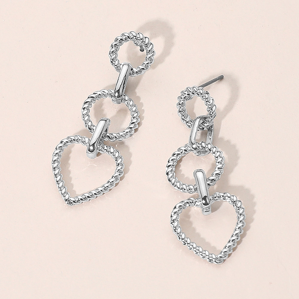 Details • Size : 0.6" X 1.75" • Post Back • Make a chic statement with these twisted heart drop earrings featuring interlinked circles and heart outlines for a refined, modern look. Lightweight and eye-catching, they bring a touch of romance and sophistication to both casual and evening ensembles. • Lead and Nickel Compliant