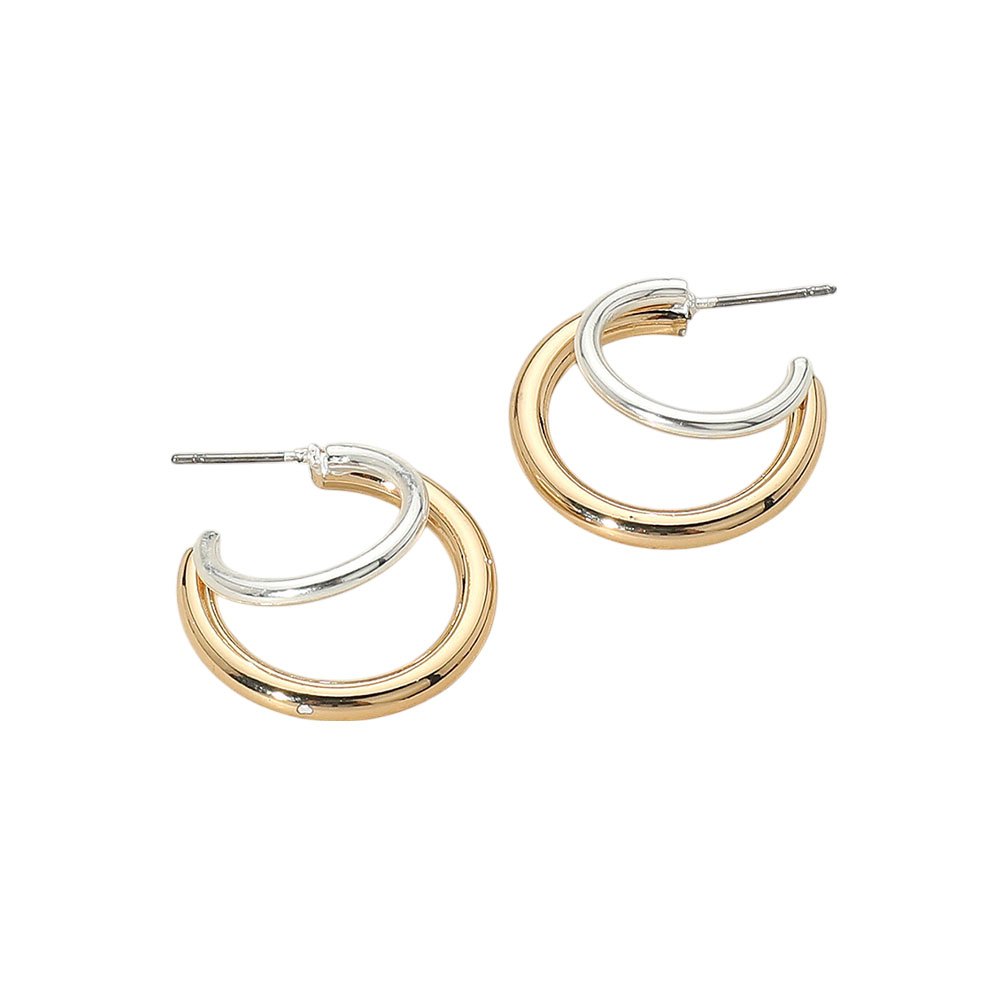 • Circular earrings featuring two interlocked open hoops in a smooth and symmetrical shape. A modern twist on a classic silhouette, ideal for elevating casual or dressy looks.