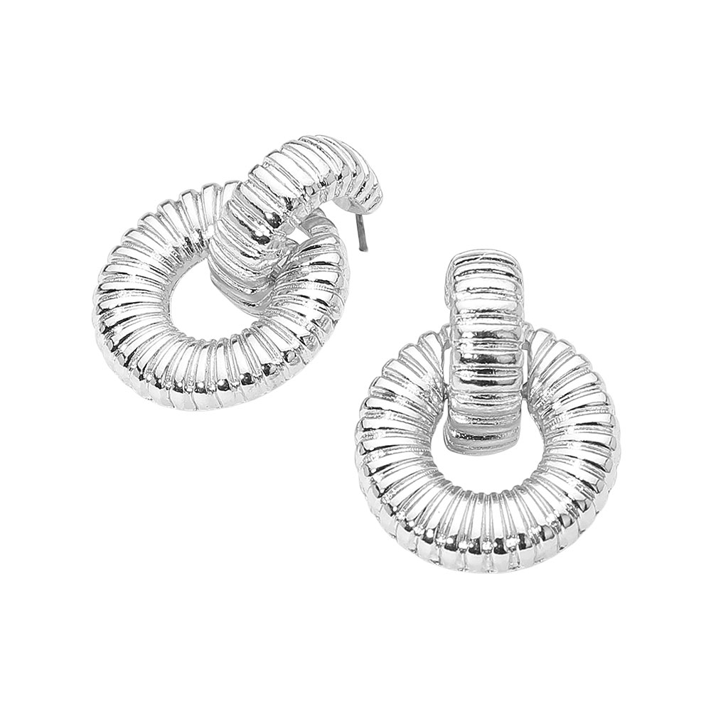 Details • Size : 1" X 1.25" • Post Back • Elevate your accessory game with these textured circle earrings. Their sculpted design and interlocking loops create a bold yet elegant statement, perfect for adding modern sophistication to both casual and dressy looks. • Lead and Nickel Compliant