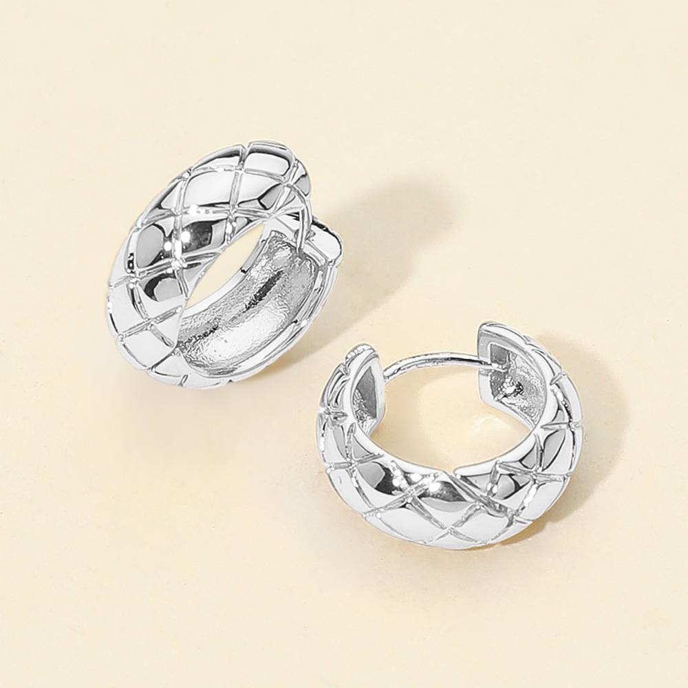 Details • Size : 0.75" X 0.75" X 0.3" • Huggie Back • Stylish quilt pattern huggie hoop earrings with a bold, textured design that elevates any look. Their compact size makes them ideal for everyday wear while still offering a touch of elegance, blending modern charm with timeless appeal for versatile accessorizing. • Brass • Gold Dipped • Hypoallergenic • Lead and Nickel Compliant • Made In Korea