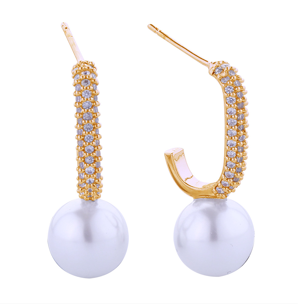 14K Gold Dipped CZ Stone Paved Glamourous Link Pearl Earrings