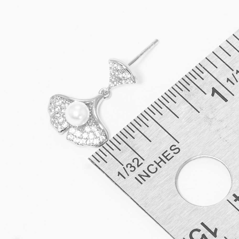 Pearl Accented CZ White Gold Dipped Ginkgo Leaf Dangle Earrings