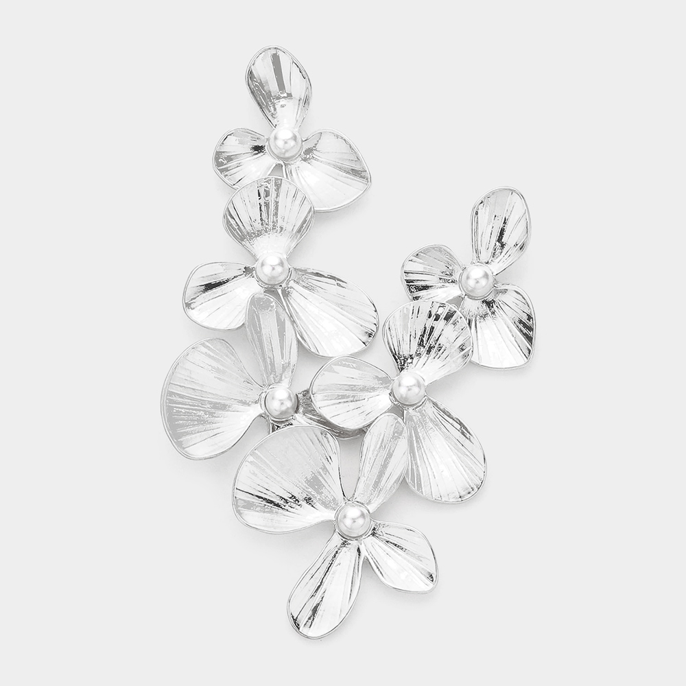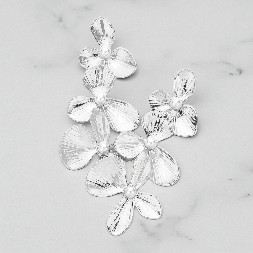 Pearl Centered Triple Flower Link Dangle Earrings