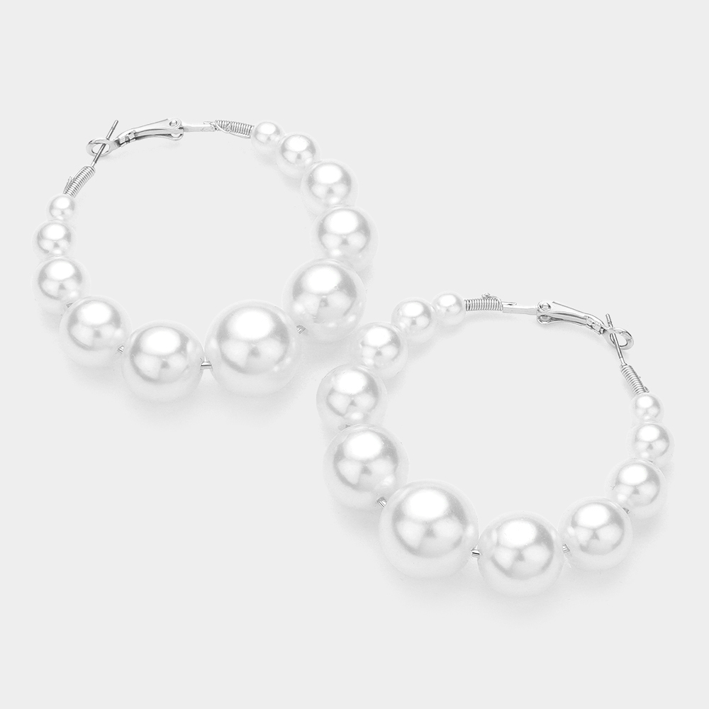 Details • Size : 2.25" X 2.25" • Omega Closure • Elevate your accessories with these bold beaded faux pearl hoop earrings featuring a playful arrangement of glossy round beads. The vibrant and dynamic design adds a fun and lively touch to your outfit, making them perfect for festivals, casual wear, or standout fashion statements. • Lead and Nickel Compliant