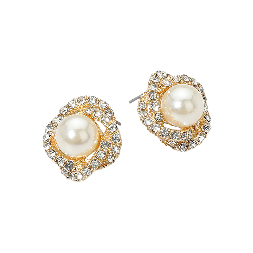 Details • Size : 0.75" X 0.75" • Post Back • Elevate your style with these pearl and crystal stud earrings, designed with a sparkling halo that adds sophistication and charm. Perfect for weddings, parties, or daily elegance, they bring timeless glamour to any outfit. • Lead and Nickel Compliant
