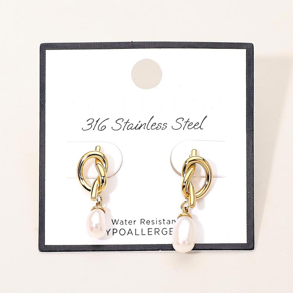 SECRET BOX_Stainless Steel Knot Pearl Drop Earrings