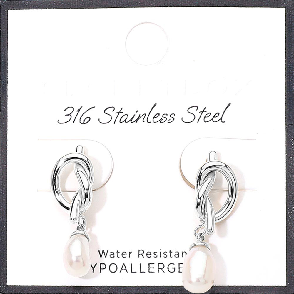 SECRET BOX_Stainless Steel Knot Pearl Drop Earrings