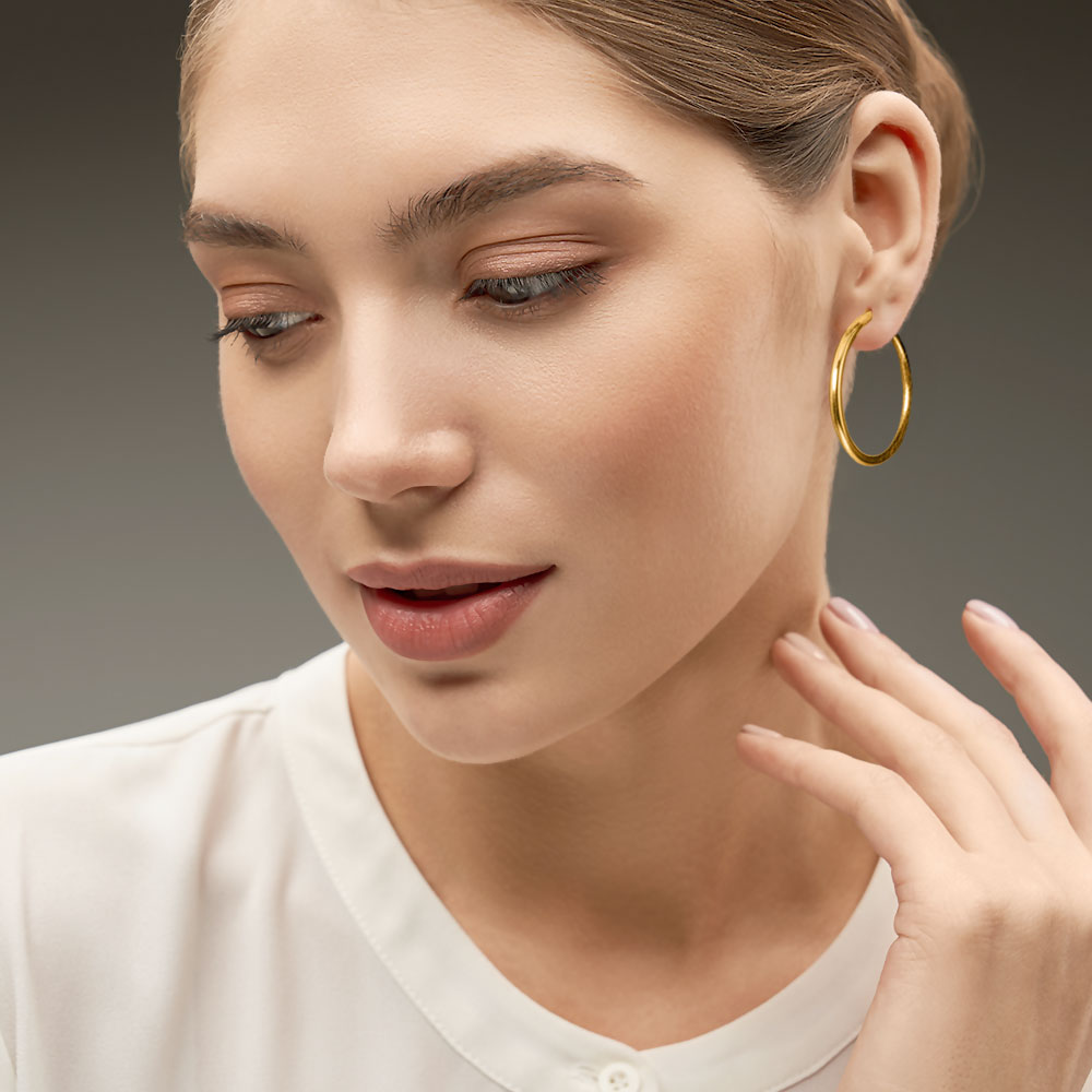 Details • Size : 1.6" X 1.6" • Pin Catch • Water resistant plating • Chic medium-small hoop earrings with a sleek, lightweight design. Perfect for everyday wear, these hoops strike the balance between subtle and stylish, offering versatile elegance that easily complements casual or professional looks. • Brass • Gold Dipped • Hypoallergenic • Lead and Nickel Compliant • Made In Korea