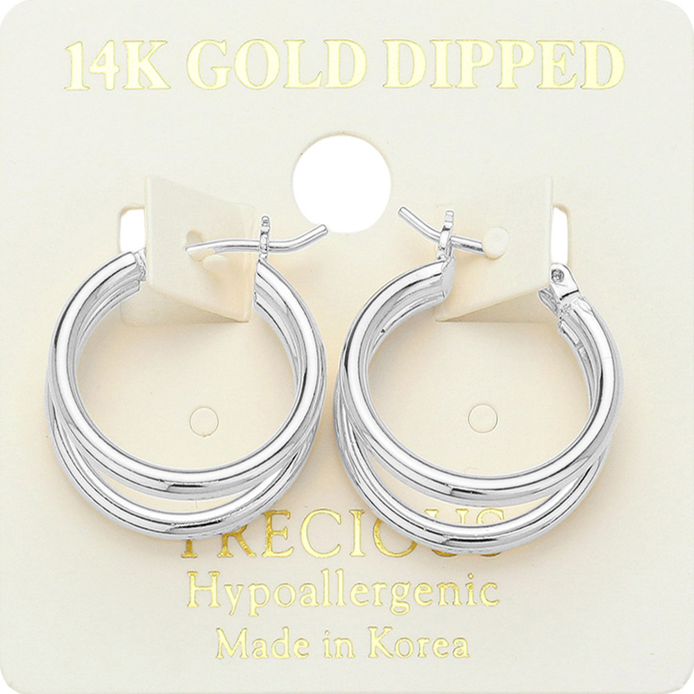 Details • Size : 0.75" X 0.75" • Pin Catch • Chic mini hoop earrings featuring a triple loop design for added dimension and style. A refined accessory that blends simplicity with elegance, ideal for both casual and formal looks. Lightweight and comfortable for all-day wear. • Hypoallergenic • Made In Korea • Gold Dipped