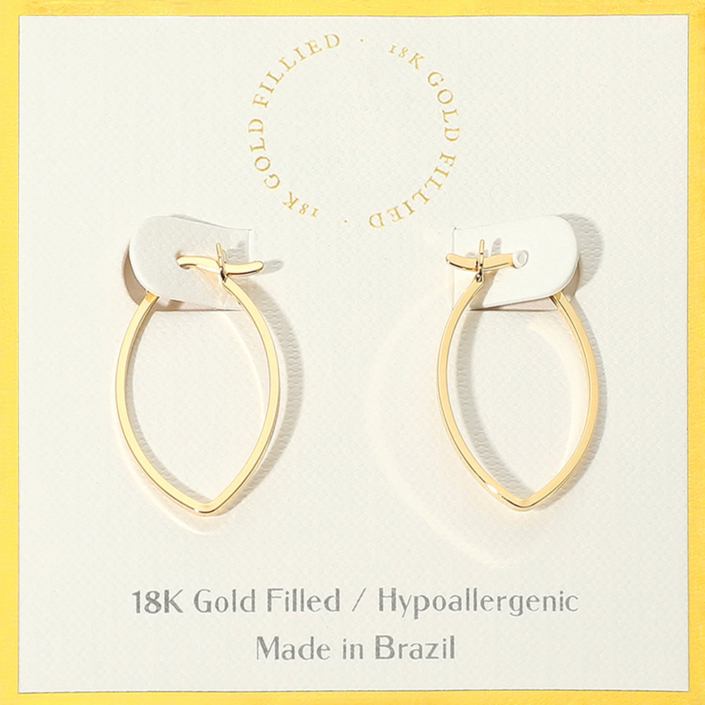 Details • Size : 0.75" X 1.1" • Pin Catch • Elegant marquise-shaped hoop earrings crafted in 18K gold filled finish. Lightweight, hypoallergenic, and made in Brazil, these earrings offer a modern twist on classic hoops. Perfect for both everyday wear and special occasions, they add sophistication and versatility to any jewelry collection. • Gold Filled • Hypoallergenic • Lead and Nickel Compliant • Made In Brazil