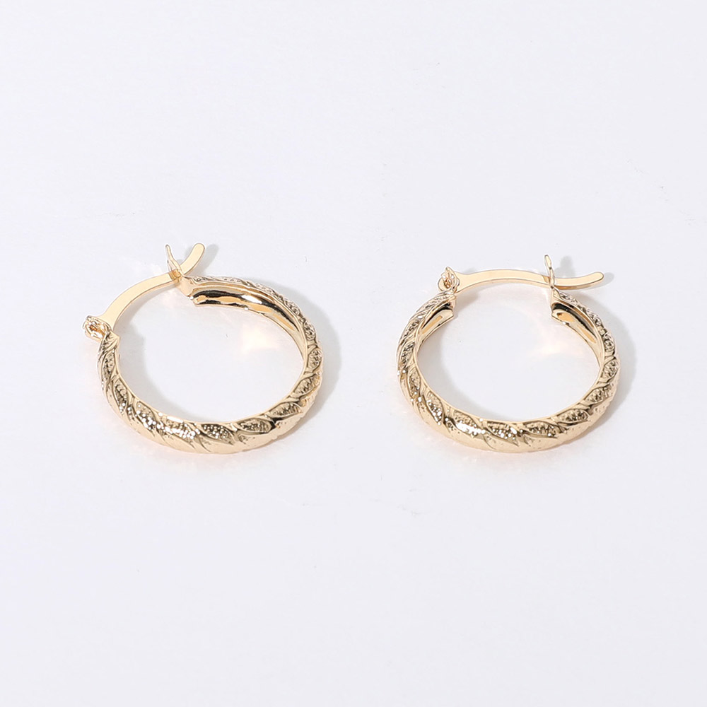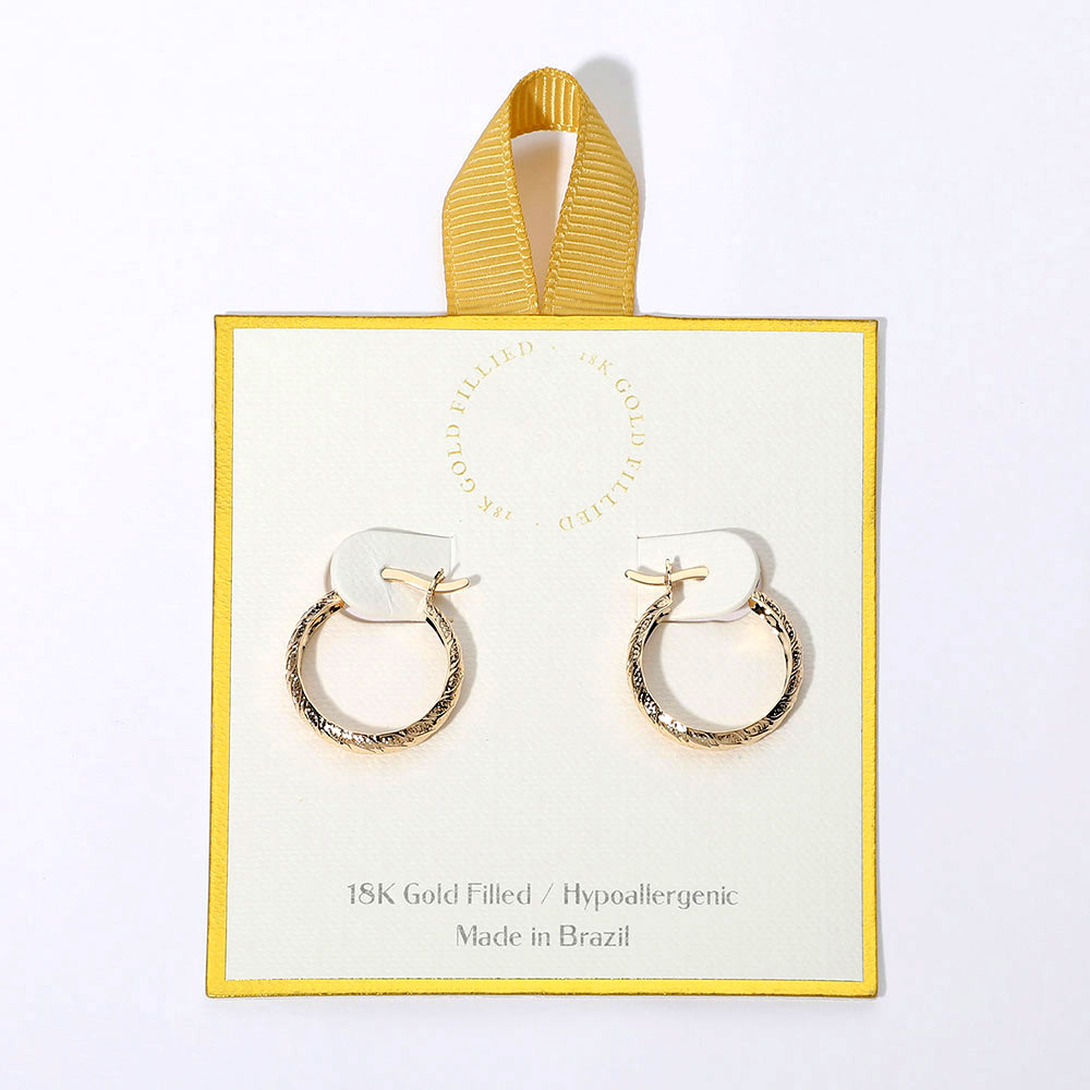 Details • Size : 0.75" X 0.8" • Pin Catch • Add a touch of elegance with these 18K gold filled textured hoop earrings, carefully crafted in Brazil. Designed with a hypoallergenic finish, they offer lasting comfort and style. Their subtle detailing makes them a timeless accessory for both casual and sophisticated looks. • Hypoallergenic • Gold Filled • Made In Brazil