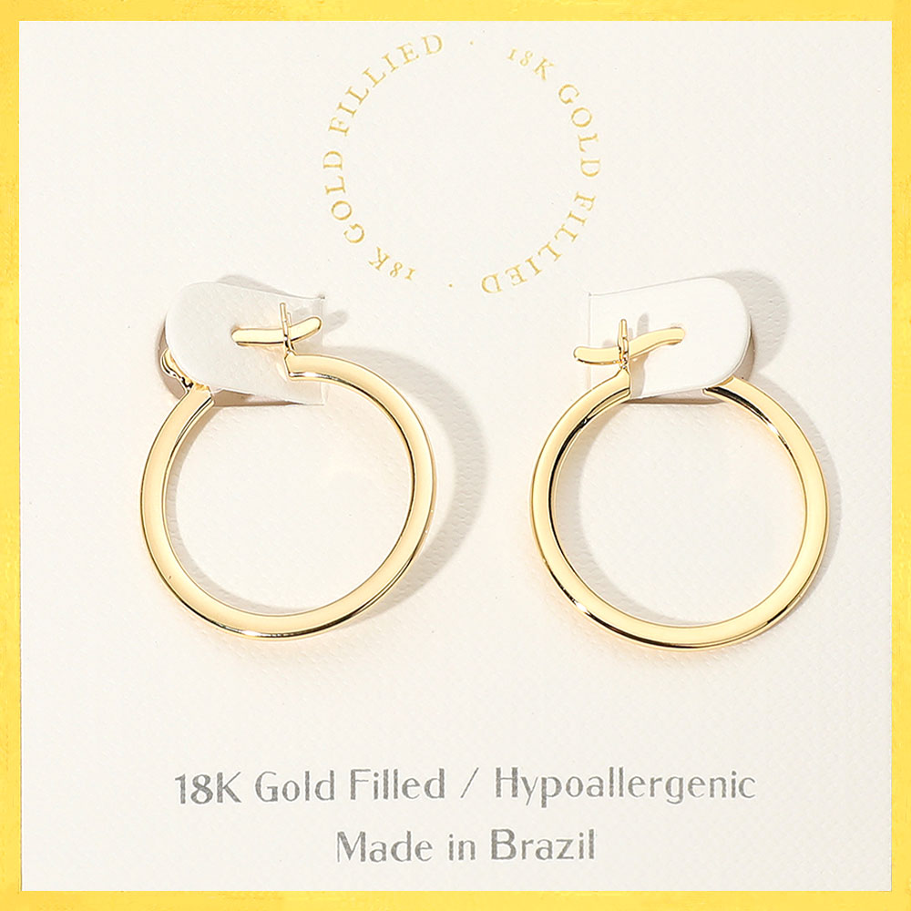 Details • Size : 1" X 1" • Pin Catch • These 18K gold filled hoop earrings feature a smooth, classic design perfect for any occasion. Lightweight and hypoallergenic, they offer lasting comfort and shine. Expertly crafted in Brazil, these timeless hoops elevate both casual and elegant looks with effortless sophistication. • Gold Filled • Hypoallergenic • Lead and Nickel Compliant • Made In Brazil