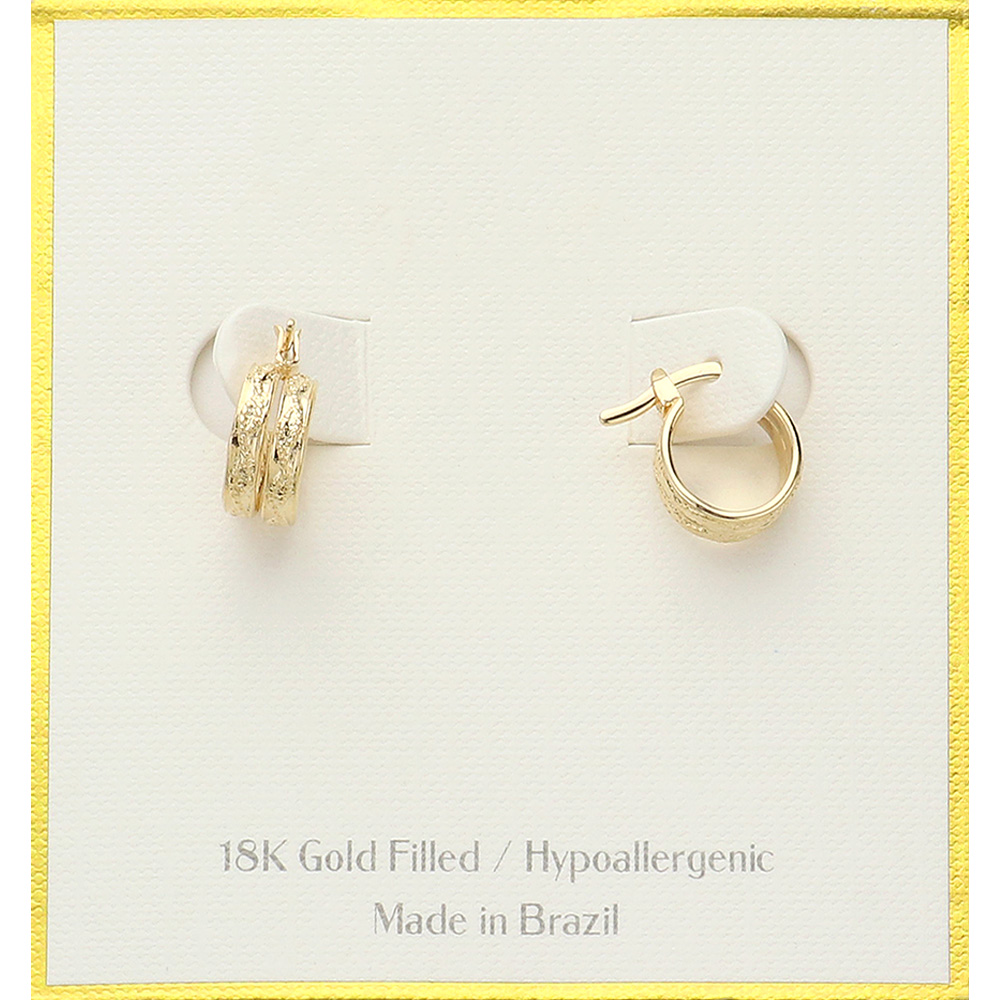 Details • Size : 0.4" X 0.5" X 0.25" • Pin Catch • Elegant small hoop earrings crafted with 18K gold filled finish for timeless shine. Designed to be hypoallergenic, they offer comfort and style for sensitive ears. Made in Brazil, these hoops are a versatile everyday accessory, perfect for layering or wearing alone for a refined minimalist look. • Lead and Nickel Compliant • Hypoallergenic • Gold Filled • Made In Brazil