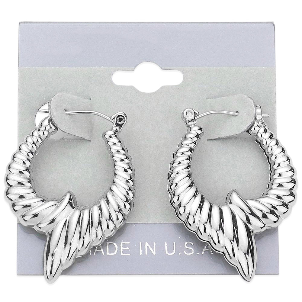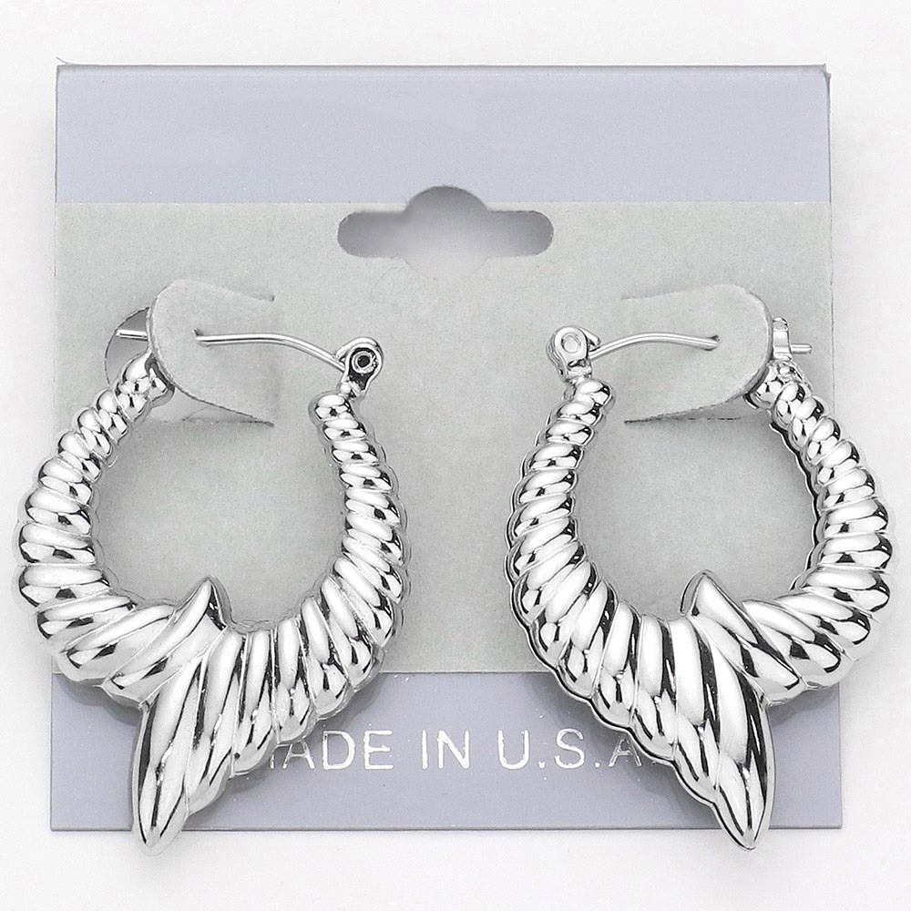 Details • Size : 1" X 1.4" • Pin Catch • Made In USA • Make a bold statement with twisted wing hoop earrings, featuring sculpted curves and intricate ridged detail for a striking look. Their unique wing-inspired silhouette adds a touch of edge and elegance, perfect for elevating everyday outfits or enhancing special occasion styles.