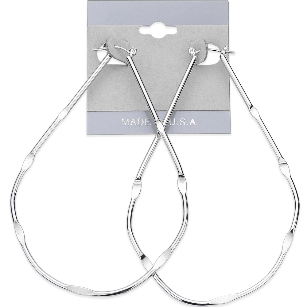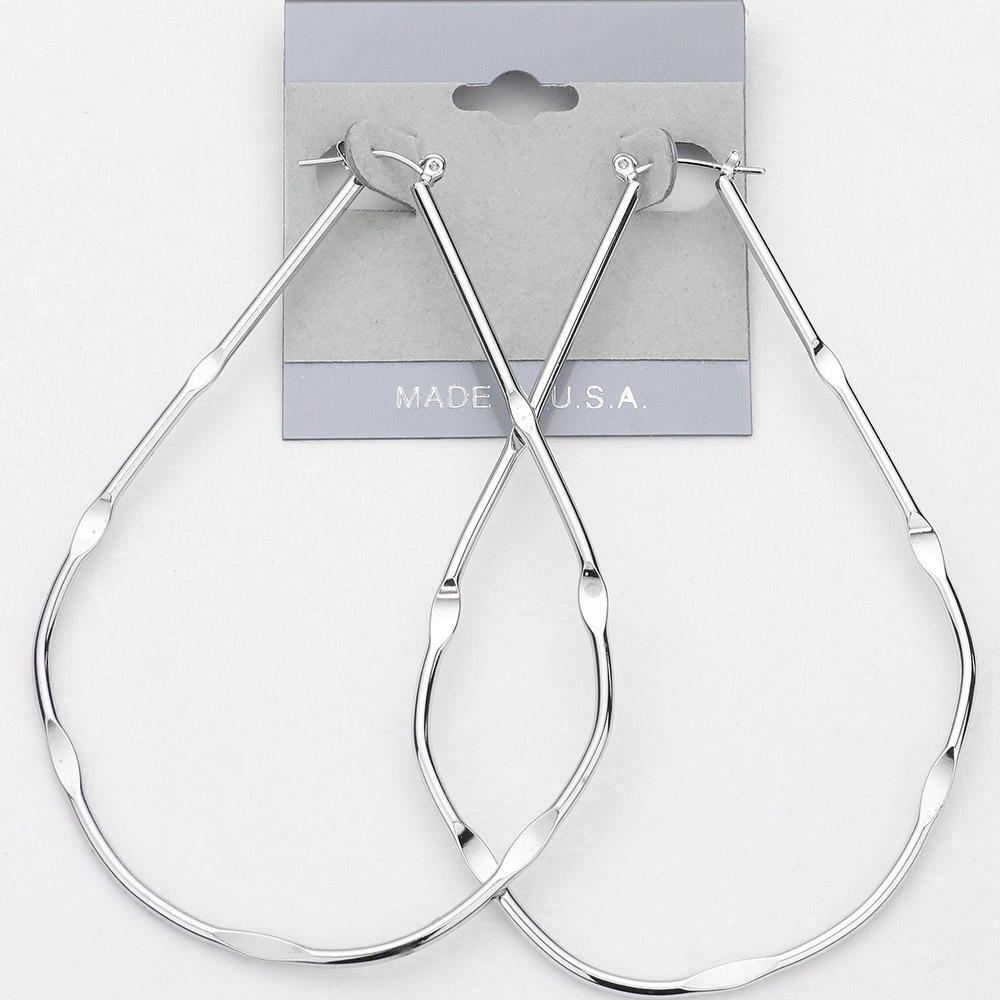 Details • Size : 2.4" X 3.6" • Pin Catch • Made In USA • Add modern flair to your accessory collection with these wavy teardrop hoop earrings. Their unique curved design offers a refreshing twist on classic hoops, making them perfect for both casual wear and special occasions. Lightweight and stylish for all-day elegance.
