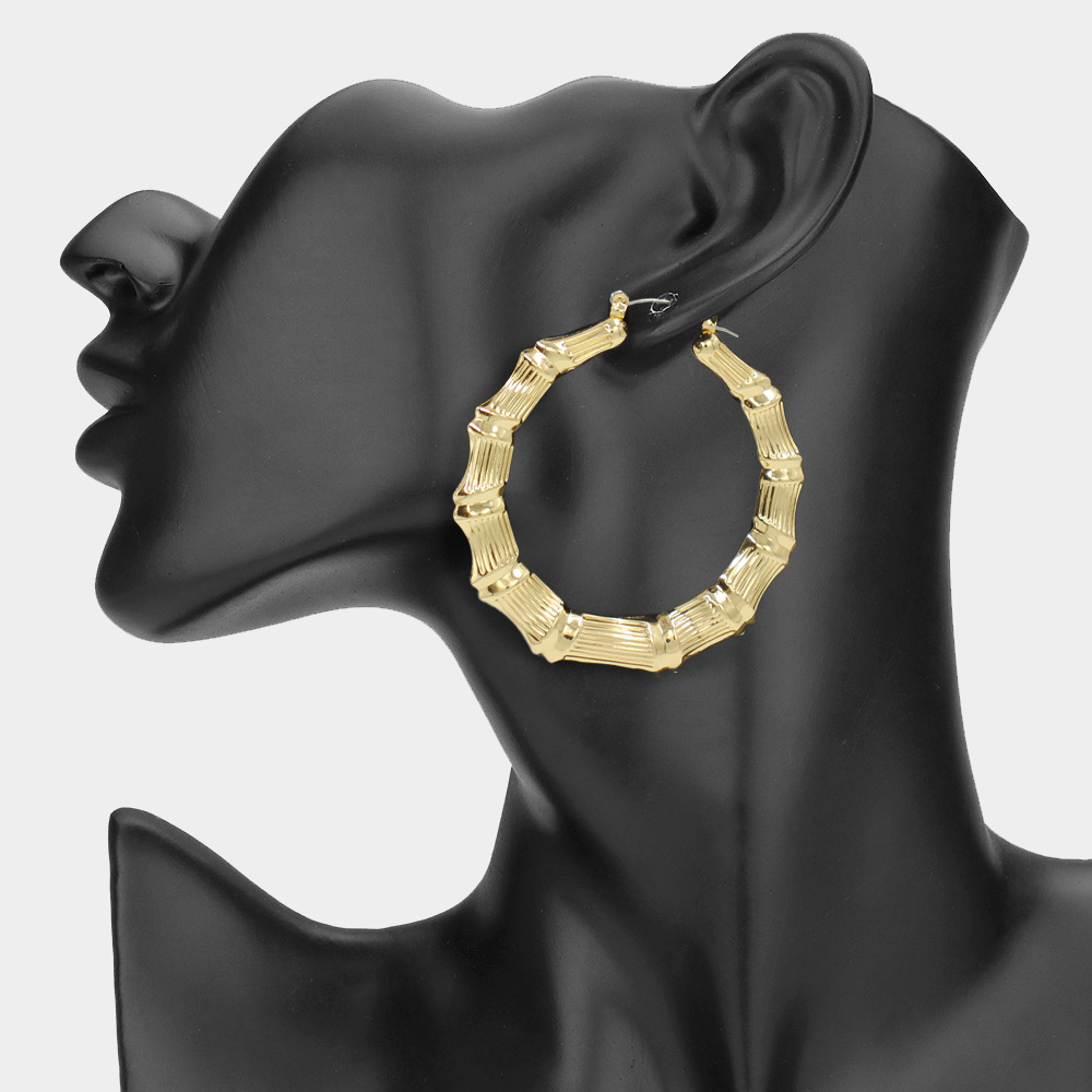 Details • Size : 1.7" X 1.7" • Pin Catch • Make a bold statement with these oversized bamboo-style hoop earrings featuring a textured design and polished finish. Lightweight yet striking, they’re perfect for elevating casual outfits or adding an edge to evening looks, making them a must-have accessory in any jewelry collection. • Lead and Nickel Compliant