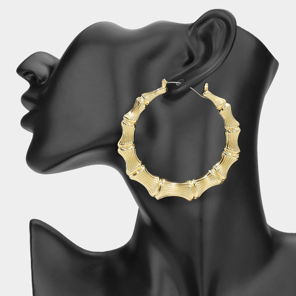 Details • Size : 2.4" X 2.4" • Pin Catch • Make a bold statement with these oversized bamboo-style hoop earrings featuring a textured design and polished finish. Lightweight yet striking, they’re perfect for elevating casual outfits or adding an edge to evening looks, making them a must-have accessory in any jewelry collection. • Lead and Nickel Compliant