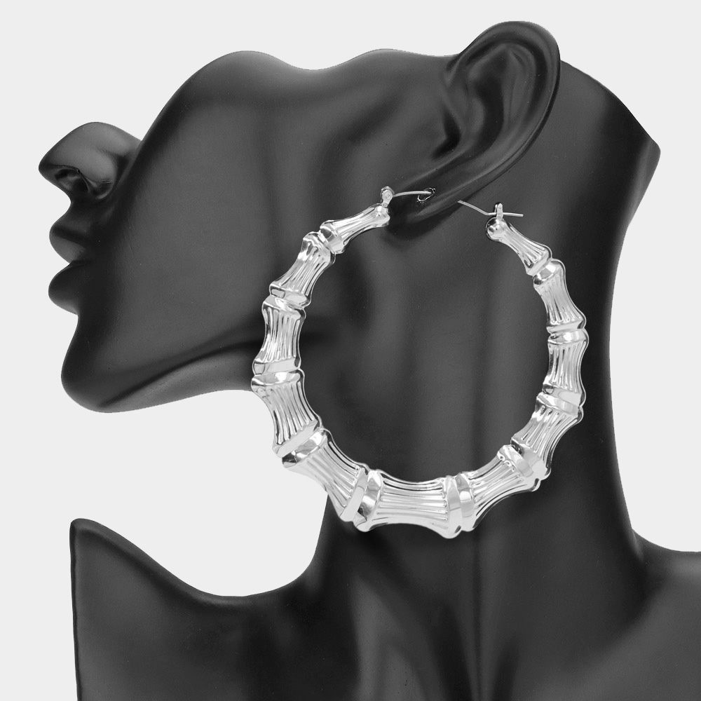 Details • Size : 3.2" X 3.2" • Pin Catch • Make a bold statement with these oversized bamboo-style hoop earrings featuring a textured design and polished finish. Lightweight yet striking, they’re perfect for elevating casual outfits or adding an edge to evening looks, making them a must-have accessory in any jewelry collection. • Lead and Nickel Compliant