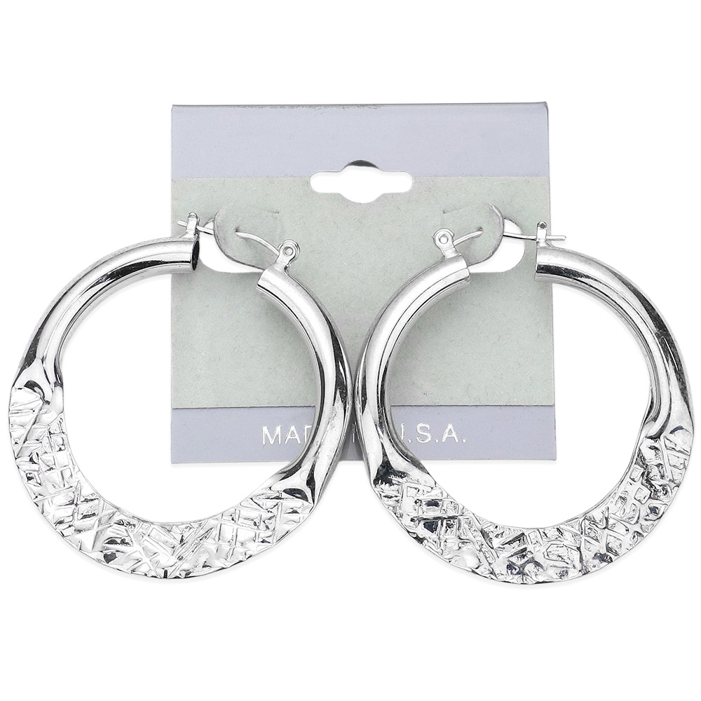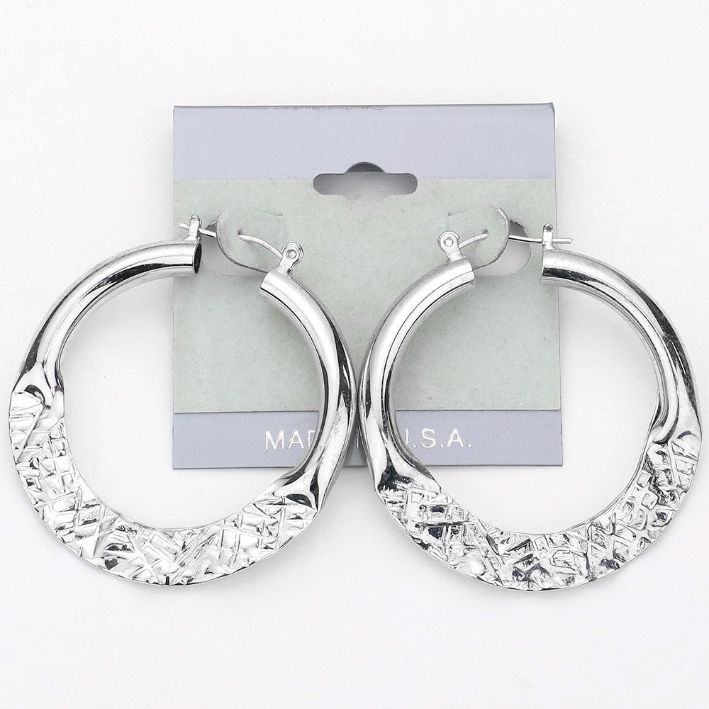 Details • Size : 1.75" L • Pin Catch • Made In USA • Add bold texture to your look with round hoop earrings featuring a unique hammered and woven-inspired surface. Their eye-catching design combines classic hoop style with modern detailing, making them a standout accessory for casual wear, evening outfits, or special events.