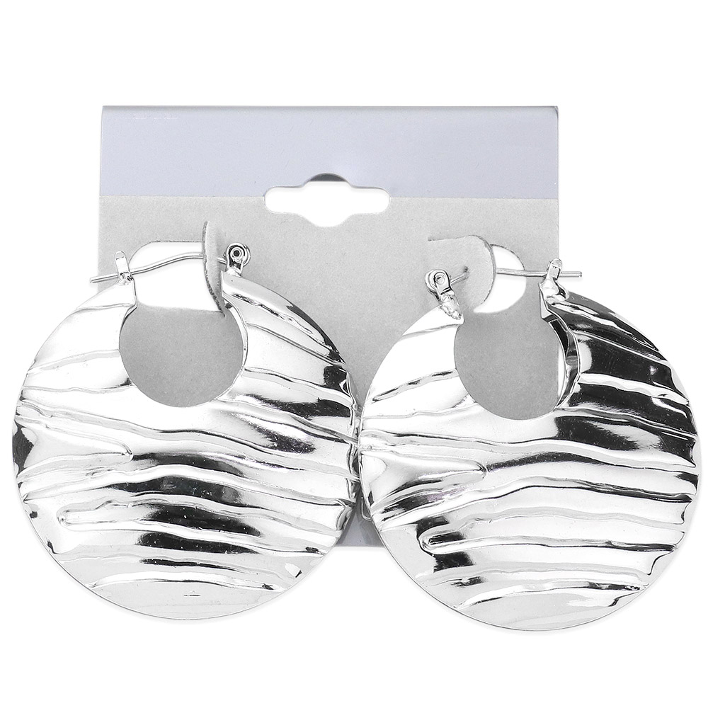Details • Size : 1.5" X 1.5" • Pin Catch • Made In USA • Elevate your accessory collection with wavy textured disc hoop earrings featuring a bold circular shape and fluid surface design. Their statement-making style adds a touch of modern elegance, perfect for pairing with casual or dressy looks for standout appeal.