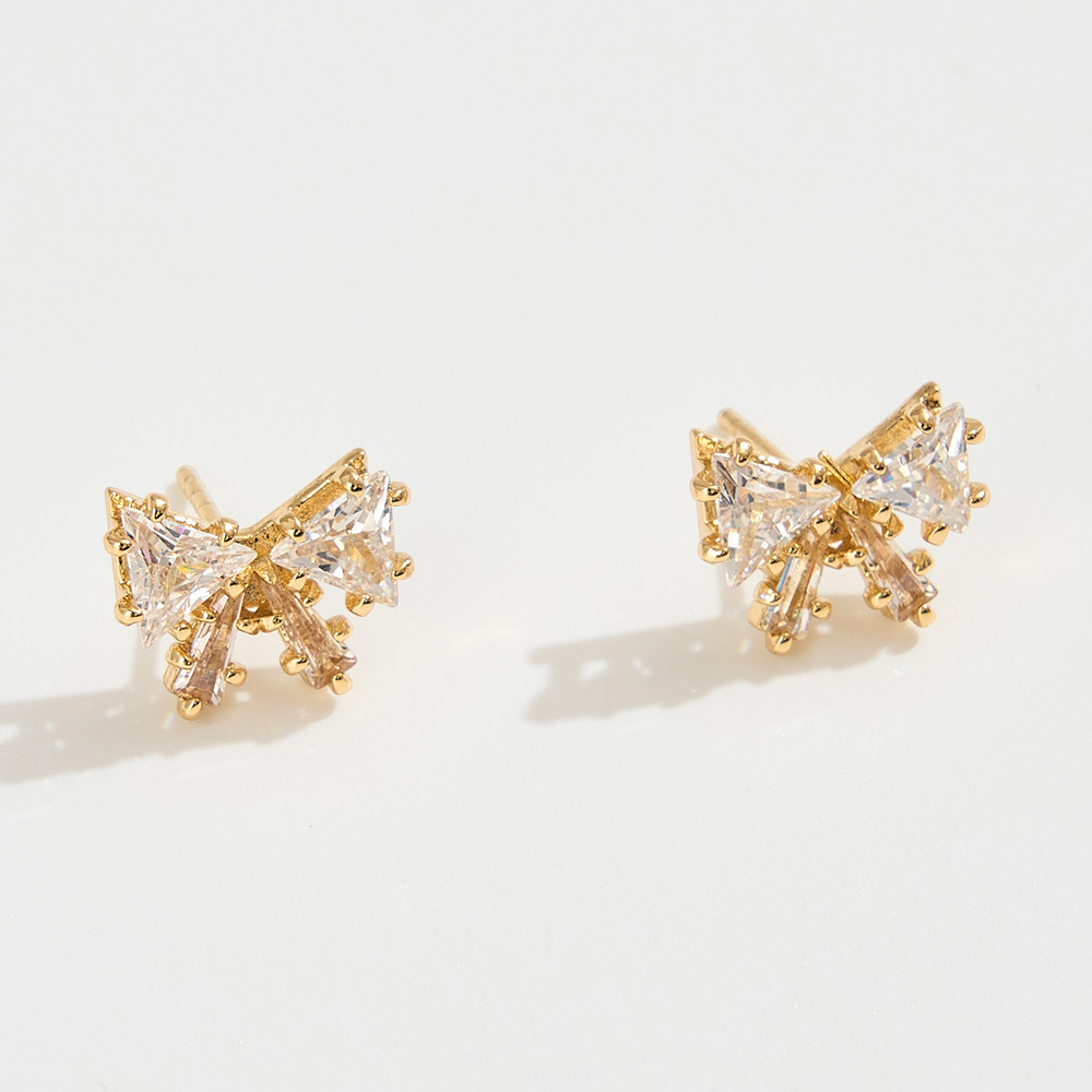 Details • Size : 0.5" X 0.4" • Post Back • These bow shaped stud earrings feature a delicate design highlighted with sparkling accents. Perfect for everyday wear or special occasions, they add a feminine touch and timeless charm while keeping your look chic, versatile, and effortlessly stylish. • Lead and Nickel Compliant • Hypoallergenic • Made In Korea • Gold Dipped • Brass