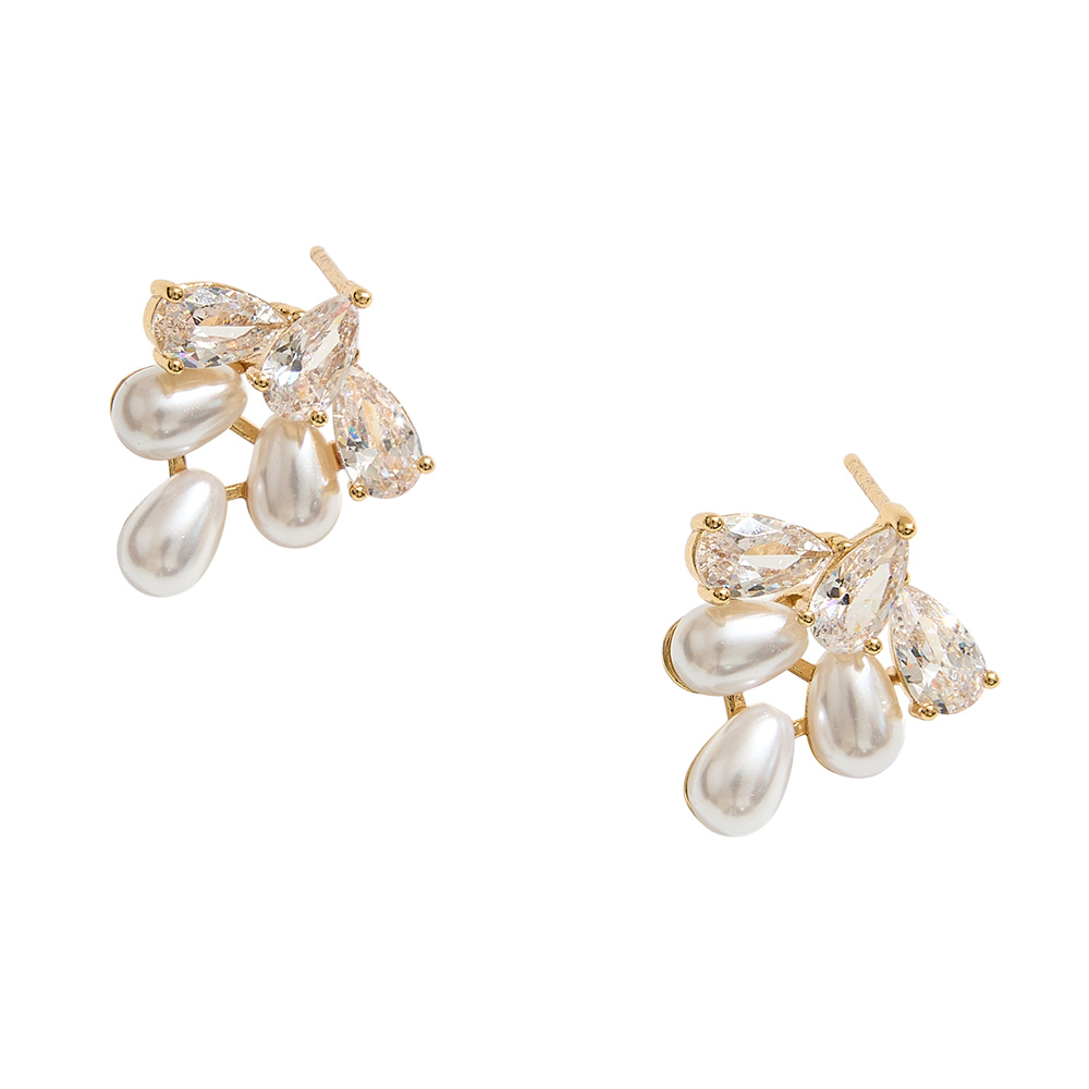Details • Size : 0.7" X 0.75" • Post Back • Shine with sophistication in these teardrop pearl and crystal cluster earrings. Designed with luminous pearl drops and sparkling crystal accents, they bring timeless elegance to any look. Perfect for weddings, evenings, or adding graceful sparkle to your everyday style. • Brass • CZ Cubic Zirconia • Gold Dipped • Hypoallergenic • Lead and Nickel Compliant • Made In Korea