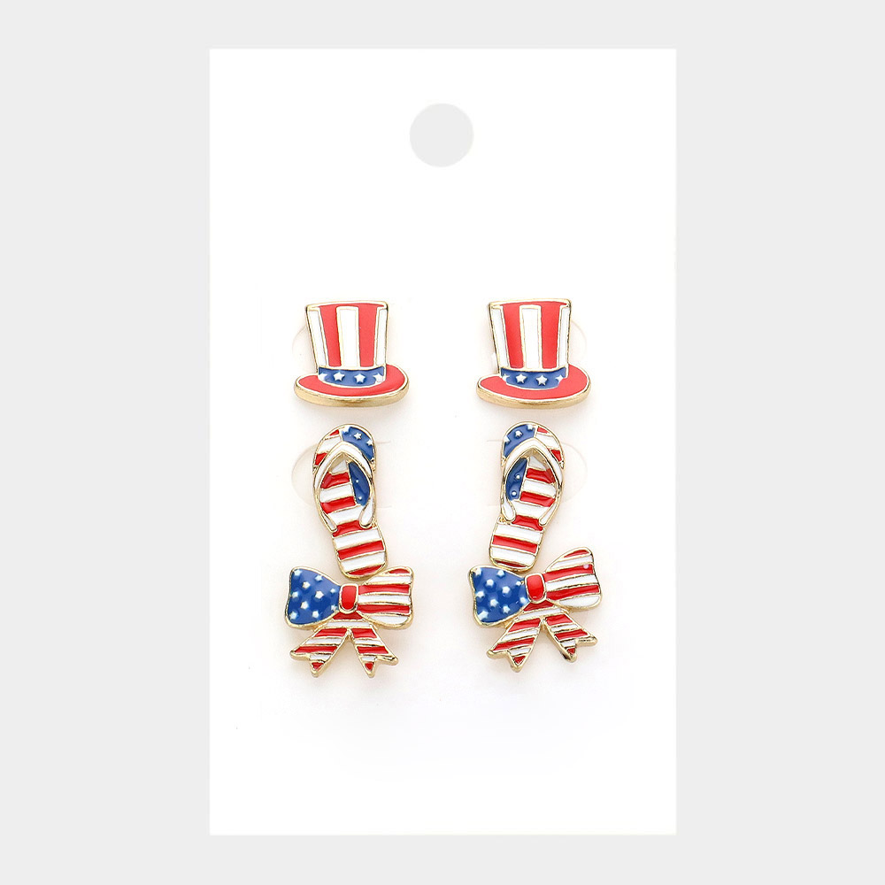 3PAIRS - American USA Flag Theme Enamel Hat Flipflops Bow Stud Earrings Set