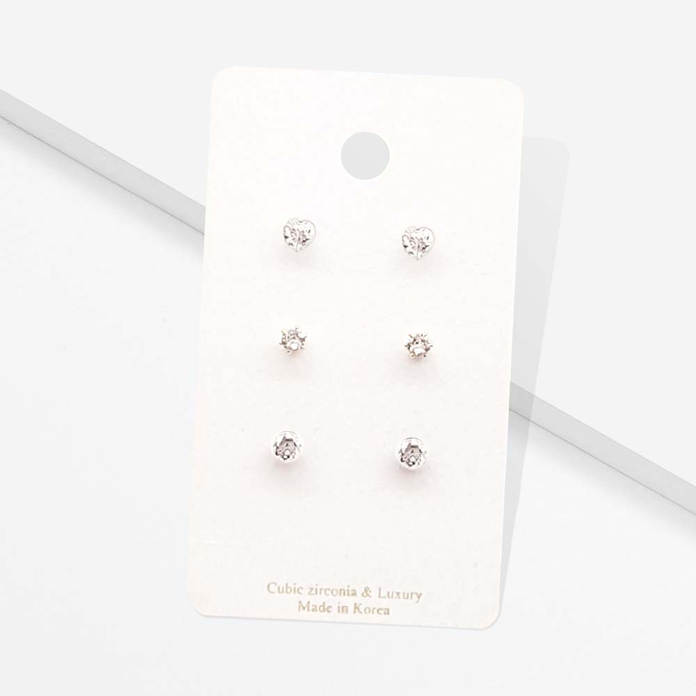 3Pairs - CZ Heart Round Stud Earrings